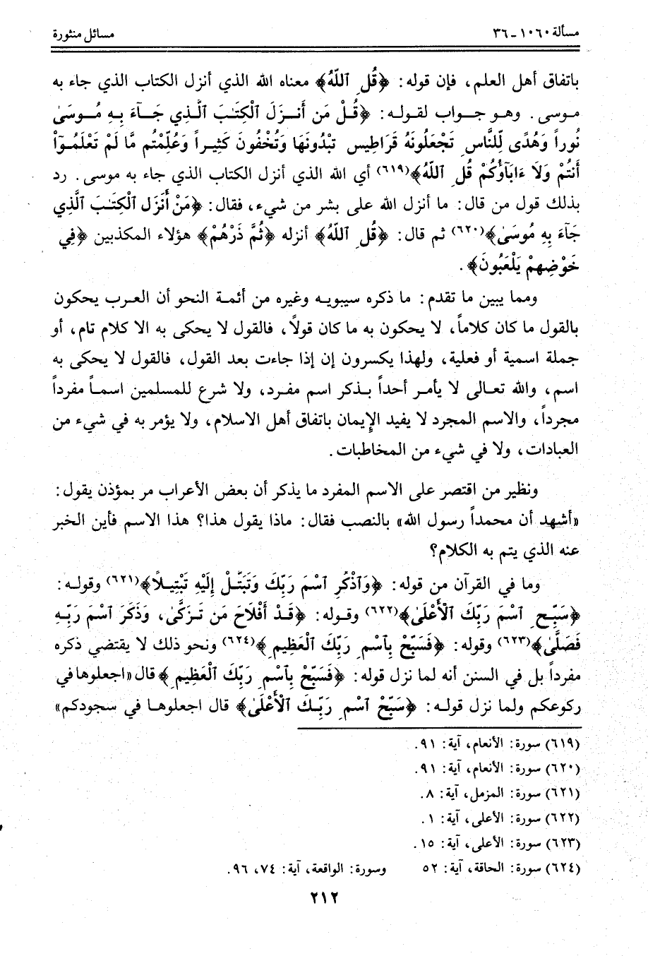 وَنَظِيرُ مَنْ اقْتَصَرَ عَلَى الِاسْمِ الْمُفْرَدِ مَا يُذْكَرُ أَنَّ بَعْضَ الْأَعْرَابِ مَرَّ بِمُؤَذِّنٍ يَقُولُ: " أَشْهَدُ أَنَّ مُحَمَّدًا رَسُولَ اللَّهِ " بِالنَّصْبِ فَقَالَ: مَاذَا يَقُولُ هَذَا؟ هَذَا الِاسْمُ فَأَيْنَ الْخَبَرُ عَنْهُ الَّذِي يَتِمُّ بِهِ الْكَلَامُ؟ وَمَا فِي الْقُرْآنِ مِنْ قَوْلِهِ: {وَاذْكُرِ اسْمَ رَبِّكَ وَتَبَتَّلْ إِلَيْهِ تَبْتِيلا} [المزمل: 8] وَقَوْلِهِ: {سَبِّحِ اسْمَ رَبِّكَ الأَعْلَى} [الأعلى: 1] وَقَوْلِهِ: {قَدْ أَفْلَحَ مَنْ تَزَكَّى} [الأعلى: 14] {وَذَكَرَ اسْمَ رَبِّهِ فَصَلَّى} [الأعلى: 15] وَقَوْلِهِ: {فَسَبِّحْ بِاسْمِ رَبِّكَ الْعَظِيمِ} [الواقعة: 74] وَنَحْوُ ذَلِكَ لَا يَقْتَضِي ذِكْرَهُ مُفْرَدًا بَلْ فِي السُّنَنِ «أَنَّهُ لَمَّا نَزَلَ قَوْلُهُ: {فَسَبِّحْ بِاسْمِ رَبِّكَ الْعَظِيمِ} [الواقعة: 74] قَالَ اجْعَلُوهَا فِي رُكُوعِكُمْ وَلَمَّا نَزَلَ قَوْلُهُ: {سَبِّحِ اسْمَ رَبِّكَ الأَعْلَى} [الأعلى: 1] قَالَ اجْعَلُوهَا فِي سُجُودِكُمْ»