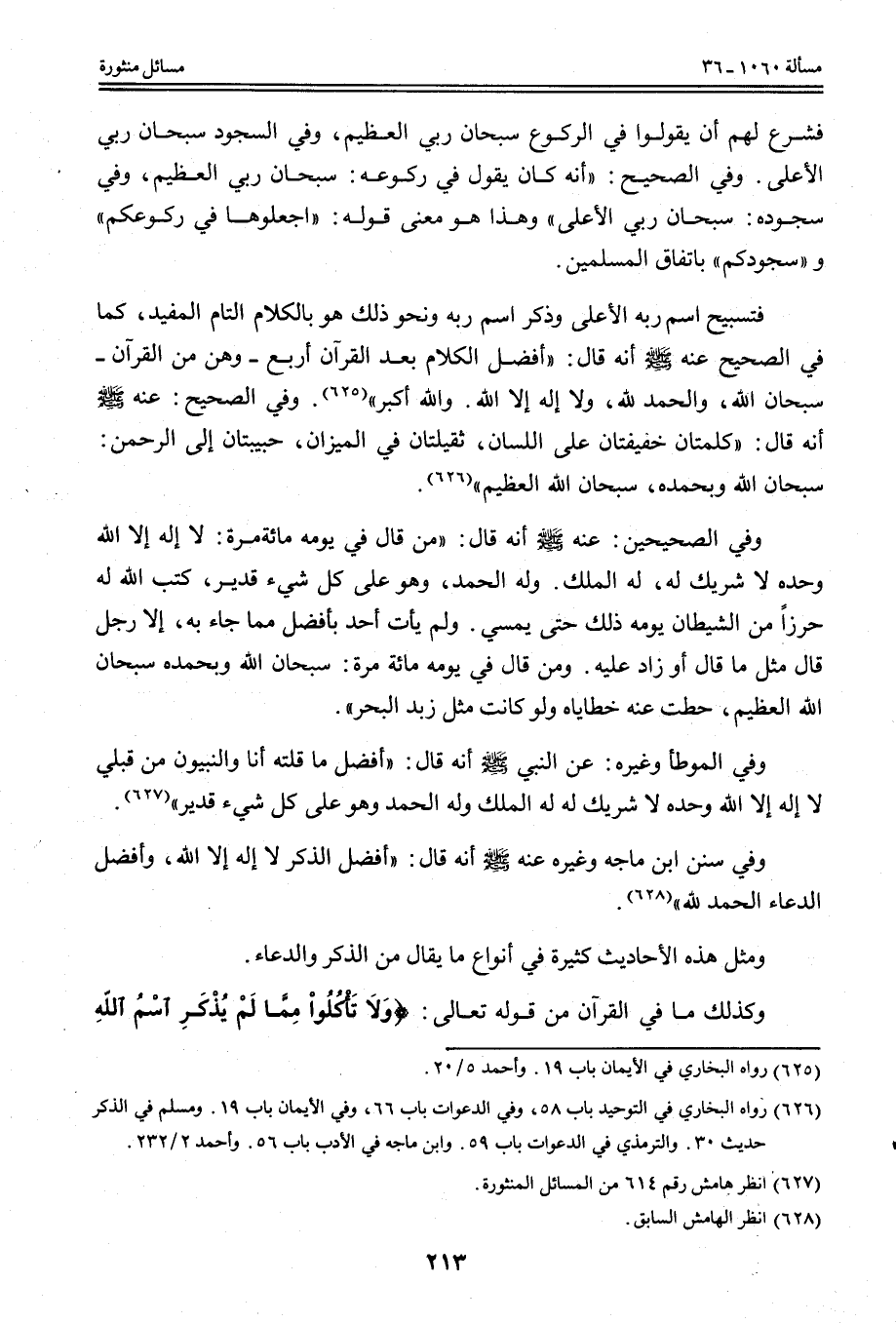 فَتَسْبِيحُ اسْمِ رَبِّهِ الْأَعْلَى وَذِكْرُ اسْمِ رَبِّهِ وَنَحْوِ ذَلِكَ هُوَ بِالْكَلَامِ التَّامِّ الْمُفِيدِ، كَمَا فِي الصَّحِيحِ عَنْهُ - صَلَّى اللَّهُ عَلَيْهِ وَسَلَّمَ - أَنَّهُ قَالَ: «أَفْضَلُ الْكَلَامِ بَعْدَ الْقُرْآنِ أَرْبَعٌ - وَهُنَّ مِنْ الْقُرْآنِ - سُبْحَانَ اللَّهِ، وَالْحَمْدُ لِلَّهِ، وَلَا إلَهَ إلَّا اللَّهُ. وَاَللَّهُ أَكْبَرُ» .