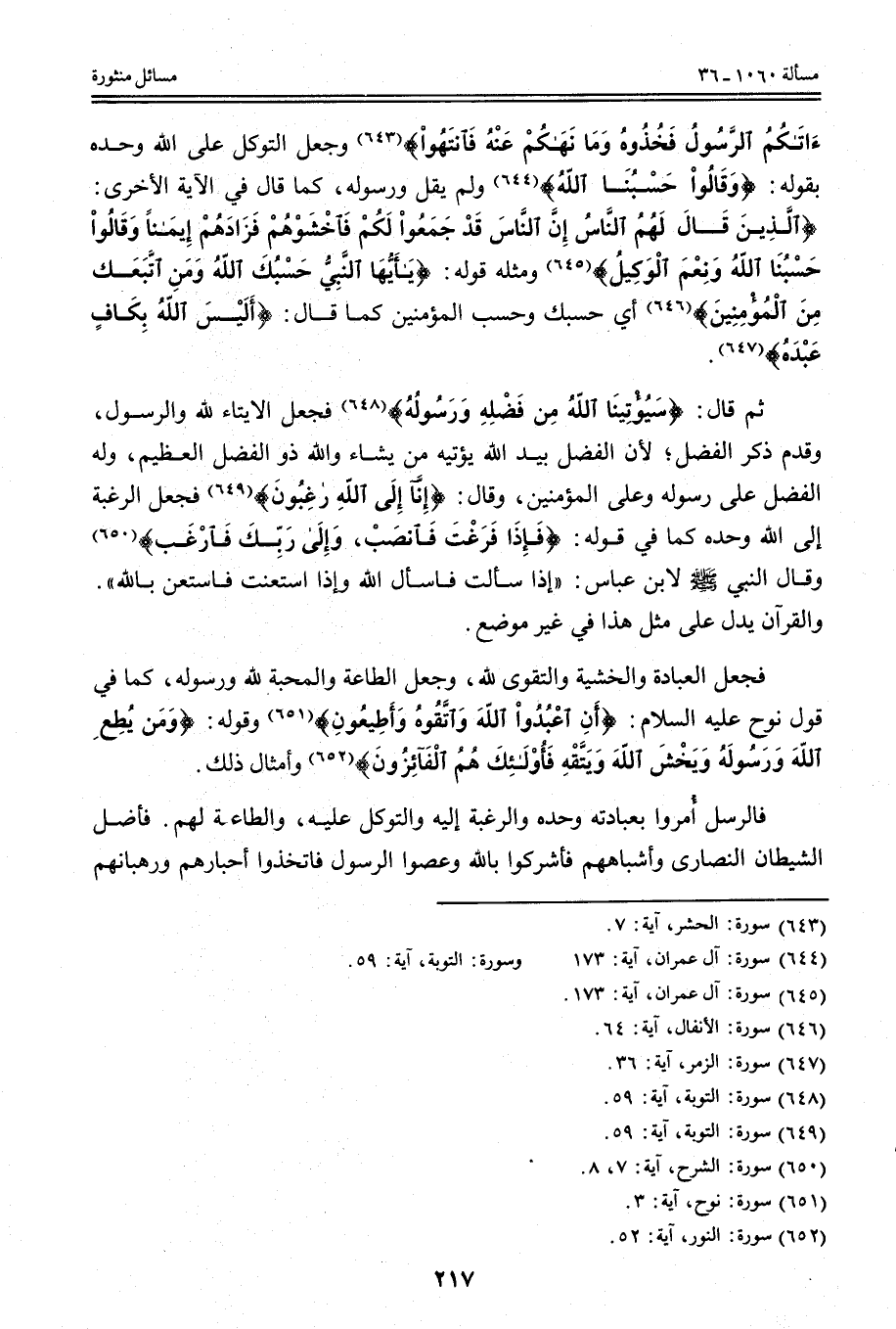 {وَمَا آتَاكُمُ الرَّسُولُ فَخُذُوهُ وَمَا نَهَاكُمْ عَنْهُ فَانْتَهُوا} [الحشر: 7] وَجَعَلَ التَّوَكُّلَ عَلَى اللَّهِ وَحْدَهُ بِقَوْلِهِ: {وَقَالُوا حَسْبُنَا اللَّهُ} [آل عمران: 173] وَلَمْ يَقُلْ وَرَسُولُهُ، كَمَا قَالَ فِي الْآيَةِ الْأُخْرَى: {الَّذِينَ قَالَ لَهُمُ النَّاسُ إِنَّ النَّاسَ قَدْ جَمَعُوا لَكُمْ فَاخْشَوْهُمْ فَزَادَهُمْ إِيمَانًا وَقَالُوا حَسْبُنَا اللَّهُ وَنِعْمَ الْوَكِيلُ} [آل عمران: 173] وَمِثْلُهُ قَوْلُهُ: {يَا أَيُّهَا النَّبِيُّ حَسْبُكَ اللَّهُ وَمَنِ اتَّبَعَكَ مِنَ الْمُؤْمِنِينَ} [الأنفال: 64] أَيْ حَسْبُكَ وَحَسْبُ الْمُؤْمِنِينَ كَمَا قَالَ: {أَلَيْسَ اللَّهُ بِكَافٍ عَبْدَهُ} [الزمر: 36] .