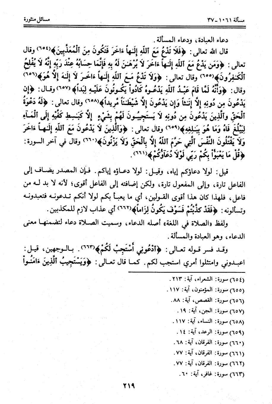 قَالَ اللَّهُ تَعَالَى: {فَلا تَدْعُ مَعَ اللَّهِ إِلَهًا آخَرَ فَتَكُونَ مِنَ الْمُعَذَّبِينَ} [الشعراء: 213] وَقَالَ تَعَالَى: {وَمَنْ يَدْعُ مَعَ اللَّهِ إِلَهًا آخَرَ لا بُرْهَانَ لَهُ بِهِ فَإِنَّمَا حِسَابُهُ عِنْدَ رَبِّهِ إِنَّهُ لا يُفْلِحُ الْكَافِرُونَ} [المؤمنون: 117] وَقَالَ تَعَالَى: {وَلا تَدْعُ مَعَ اللَّهِ إِلَهًا آخَرَ لا إِلَهَ إِلا هُوَ} [القصص: 88] وَقَالَ: {وَأَنَّهُ لَمَّا قَامَ عَبْدُ اللَّهِ يَدْعُوهُ كَادُوا يَكُونُونَ عَلَيْهِ لِبَدًا} [الجن: 19] وَقَالَ: {إِنْ يَدْعُونَ مِنْ دُونِهِ إِلا إِنَاثًا وَإِنْ يَدْعُونَ إِلا شَيْطَانًا مَرِيدًا} [النساء: 117] وَقَالَ تَعَالَى: {لَهُ دَعْوَةُ الْحَقِّ وَالَّذِينَ يَدْعُونَ مِنْ دُونِهِ لا يَسْتَجِيبُونَ لَهُمْ بِشَيْءٍ إِلا كَبَاسِطِ كَفَّيْهِ إِلَى الْمَاءِ لِيَبْلُغَ فَاهُ وَمَا هُوَ بِبَالِغِهِ} [الرعد: 14] وَقَالَ تَعَالَى: {وَالَّذِينَ لا يَدْعُونَ مَعَ اللَّهِ إِلَهًا آخَرَ وَلا يَقْتُلُونَ النَّفْسَ الَّتِي حَرَّمَ اللَّهُ إِلا بِالْحَقِّ وَلا يَزْنُونَ} [الفرقان: 68] وَقَالَ فِي آخِرِ السُّورَةِ: {قُلْ مَا يَعْبَأُ بِكُمْ رَبِّي لَوْلا دُعَاؤُكُمْ} [الفرقان: 77] .