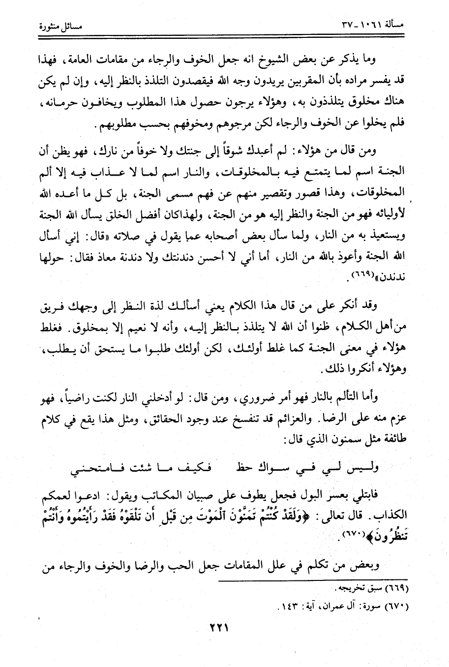 وَمَا يُذْكَرُ عَنْ بَعْضِ الشُّيُوخِ أَنَّهُ جَعَلَ الْخَوْفَ وَالرَّجَاءَ مِنْ مَقَامَاتِ الْعَامَّةِ، فَهَذَا قَدْ يُفَسَّرُ مُرَادُهُ بِأَنَّ الْمُقَرَّبِينَ يُرِيدُونَ وَجْهَ اللَّهِ فَيَقْصِدُونَ التَّلَذُّذَ بِالنَّظَرِ إلَيْهِ، وَإِنْ لَمْ يَكُنْ هُنَاكَ مَخْلُوقٌ يَتَلَذَّذُونَ بِهِ، وَهَؤُلَاءِ يَرْجُونَ حُصُولَ هَذَا الْمَطْلُوبِ وَيَخَافُونَ حِرْمَانَهُ، فَلَمْ يَخْلُو عَنْ الْخَوْفِ وَالرَّجَاءِ لَكِنَّ مَرْجُوَّهُمْ وَمُخَوِّفَهُمْ بِحَسَبِ مَطْلُوبِهِمْ.