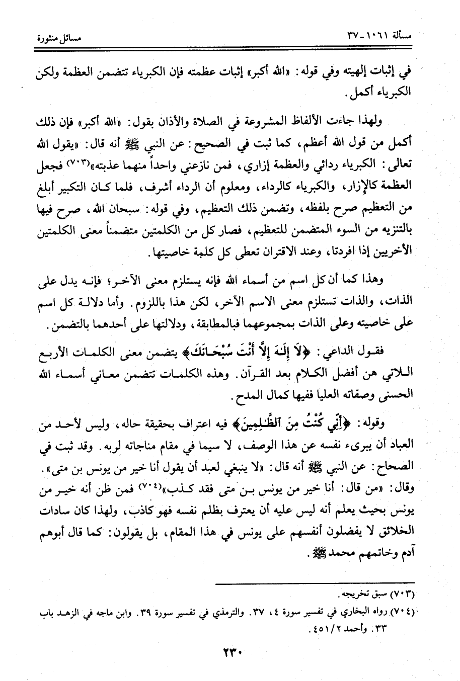 وَقَدْ ثَبَتَ فِي الصِّحَاحِ: عَنْ النَّبِيِّ - صَلَّى اللَّهُ عَلَيْهِ وَسَلَّمَ - أَنَّهُ قَالَ: «لَا يَنْبَغِي لِعَبْدٍ أَنْ يَقُولَ أَنَا خَيْرٌ مِنْ يُونُسَ بْنِ مَتَّى» . وَقَالَ: «مَنْ قَالَ: أَنَا خَيْرٌ مِنْ يُونُسَ بْنِ مَتَّى فَقَدْ كَذَبَ» فَمَنْ ظَنَّ أَنَّهُ خَيْرٌ مِنْ يُونُسَ بِحَيْثُ يَعْلَمُ أَنَّهُ لَيْسَ عَلَيْهِ أَنْ يَعْتَرِفَ بِظُلْمِ نَفْسِهِ فَهُوَ كَاذِبٌ، وَلِهَذَا كَانَ سَادَاتُ الْخَلَائِقِ لَا يَفْضُلُونَ أَنْفُسَهُمْ عَلَى يُونُسَ فِي هَذَا الْمَقَامِ، بَلْ يَقُولُونَ: كَمَا قَالَ أَبُوهُمْ آدَم وَخَاتِمُهُمْ مُحَمَّدٌ.