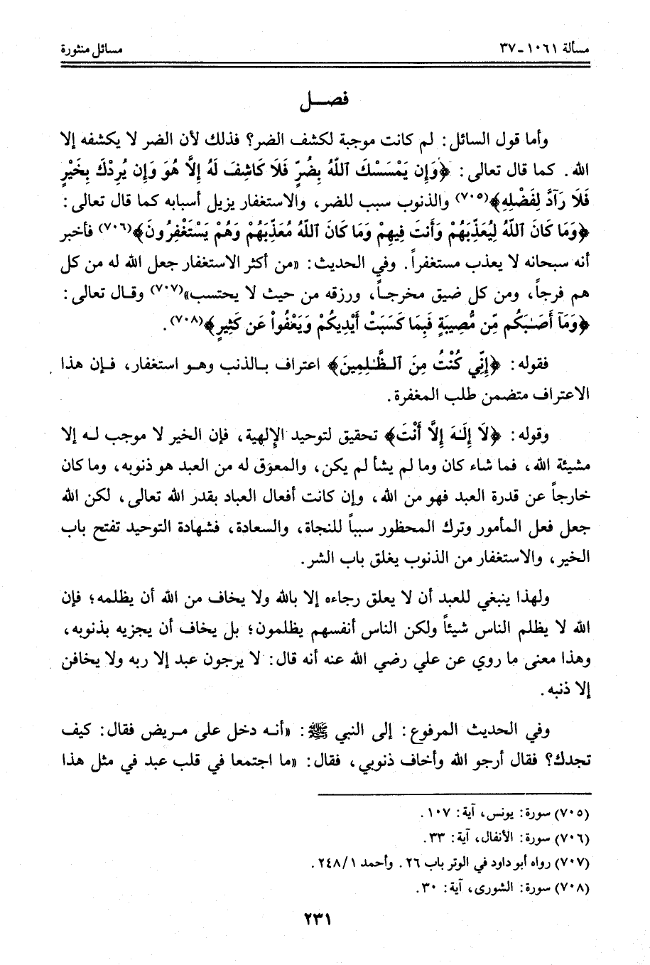 كَمَا قَالَ تَعَالَى: {وَإِنْ يَمْسَسْكَ اللَّهُ بِضُرٍّ فَلا كَاشِفَ لَهُ إِلا هُوَ وَإِنْ يُرِدْكَ بِخَيْرٍ فَلا رَادَّ لِفَضْلِهِ} [يونس: 107] وَالذُّنُوبُ سَبَبٌ لِلضُّرِّ، وَالِاسْتِغْفَارُ يُزِيلُ أَسْبَابَهُ كَمَا قَالَ تَعَالَى: {وَمَا كَانَ اللَّهُ لِيُعَذِّبَهُمْ وَأَنْتَ فِيهِمْ وَمَا كَانَ اللَّهُ مُعَذِّبَهُمْ وَهُمْ يَسْتَغْفِرُونَ} [الأنفال: 33] فَأَخْبَرَ أَنَّهُ سُبْحَانَهُ لَا يُعَذِّبُ مُسْتَغْفِرًا.