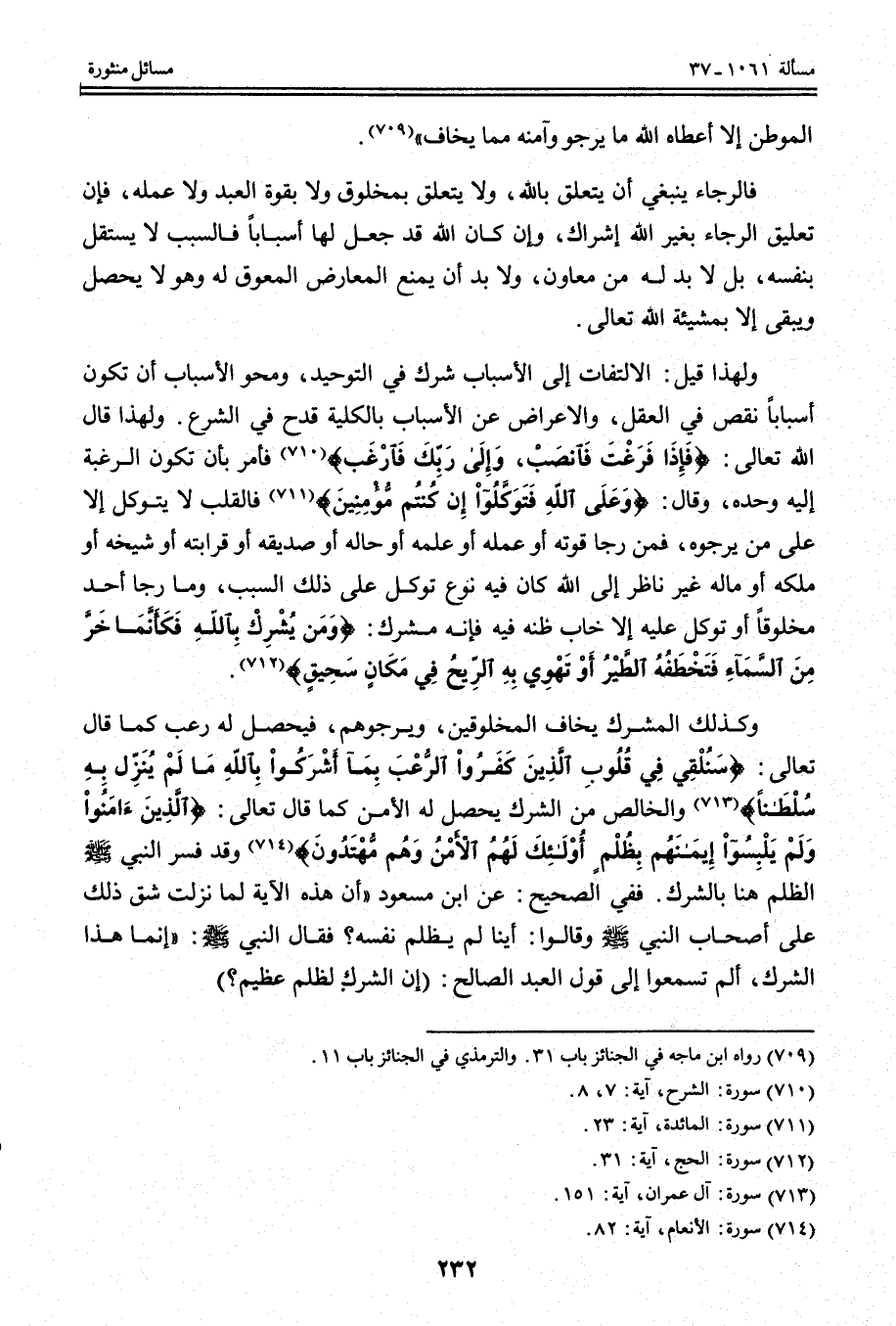 وَكَذَلِكَ الْمُشْرِكُ يَخَافُ الْمَخْلُوقِينَ، وَيَرْجُوهُمْ، فَيَحْصُلُ لَهُ رُعْبٌ كَمَا قَالَ تَعَالَى: {سَنُلْقِي فِي قُلُوبِ الَّذِينَ كَفَرُوا الرُّعْبَ بِمَا أَشْرَكُوا بِاللَّهِ مَا لَمْ يُنَزِّلْ بِهِ سُلْطَانًا} [آل عمران: 151] وَالْخَالِصُ مِنْ الشِّرْكِ يَحْصُلُ لَهُ الْأَمْنُ كَمَا قَالَ تَعَالَى: {الَّذِينَ آمَنُوا وَلَمْ يَلْبِسُوا إِيمَانَهُمْ بِظُلْمٍ أُولَئِكَ لَهُمُ الأَمْنُ وَهُمْ مُهْتَدُونَ} [الأنعام: 82] وَقَدْ فَسَّرَ النَّبِيُّ - صَلَّى اللَّهُ عَلَيْهِ وَسَلَّمَ - الظُّلْمَ هُنَا بِالشِّرْكِ.