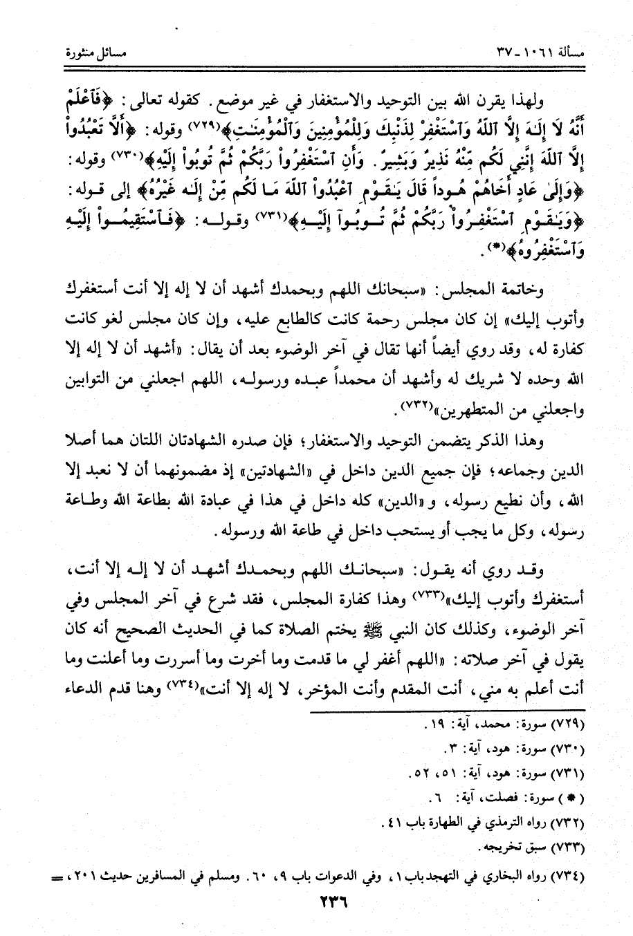 وَلِهَذَا يَقْرُنُ اللَّهُ بَيْنَ التَّوْحِيدِ وَالِاسْتِغْفَارِ فِي غَيْرِ مَوْضِعٍ.