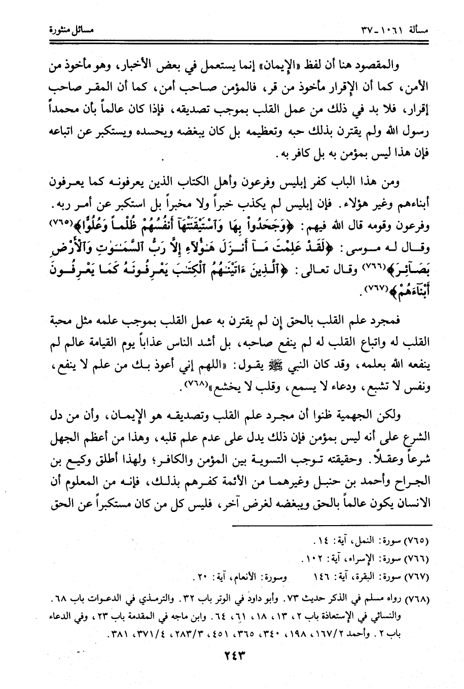وَلَكِنَّ الْجَهْمِيَّةَ ظَنُّوا أَنَّ مُجَرَّدَ عِلْمِ الْقَلْبِ وَتَصْدِيقِهِ هُوَ الْإِيمَانُ، وَأَنَّ مَنْ دَلَّ الشَّرْعُ عَلَى أَنَّهُ لَيْسَ بِمُؤْمِنٍ فَإِنَّ ذَلِكَ يَدُلُّ عَلَى عَدَمِ عِلْمِ قَلْبِهِ وَهَذَا مِنْ أَعْظَمِ الْجَهْلِ شَرْعًا وَعَقْلًا