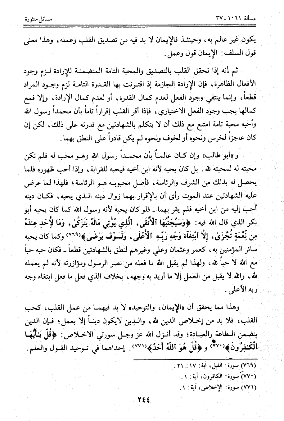 وَهَذَا مِمَّا يُحَقِّقُ أَنَّ " الْإِيمَانَ، وَالتَّوْحِيدَ " لَا بُدَّ فِيهِمَا مِنْ عَمَلِ الْقَلْبِ، كَحُبِّ الْقَلْبِ، فَلَا بُدَّ مِنْ إخْلَاصِ الدِّينِ لِلَّهِ، وَالدِّينُ لَا يَكُونُ دِينًا إلَّا بِعَمَلٍ؛ فَإِنَّ الدِّينَ يَتَضَمَّنُ الطَّاعَةَ وَالْعِبَادَةَ؛ وَقَدْ أَنْزَلَ اللَّهُ عَزَّ وَجَلَّ سُورَتَيْ الْإِخْلَاصِ: {قُلْ يَا أَيُّهَا الْكَافِرُونَ} [الكافرون: 1] وَ {قُلْ هُوَ اللَّهُ أَحَدٌ} [الإخلاص: 1] .