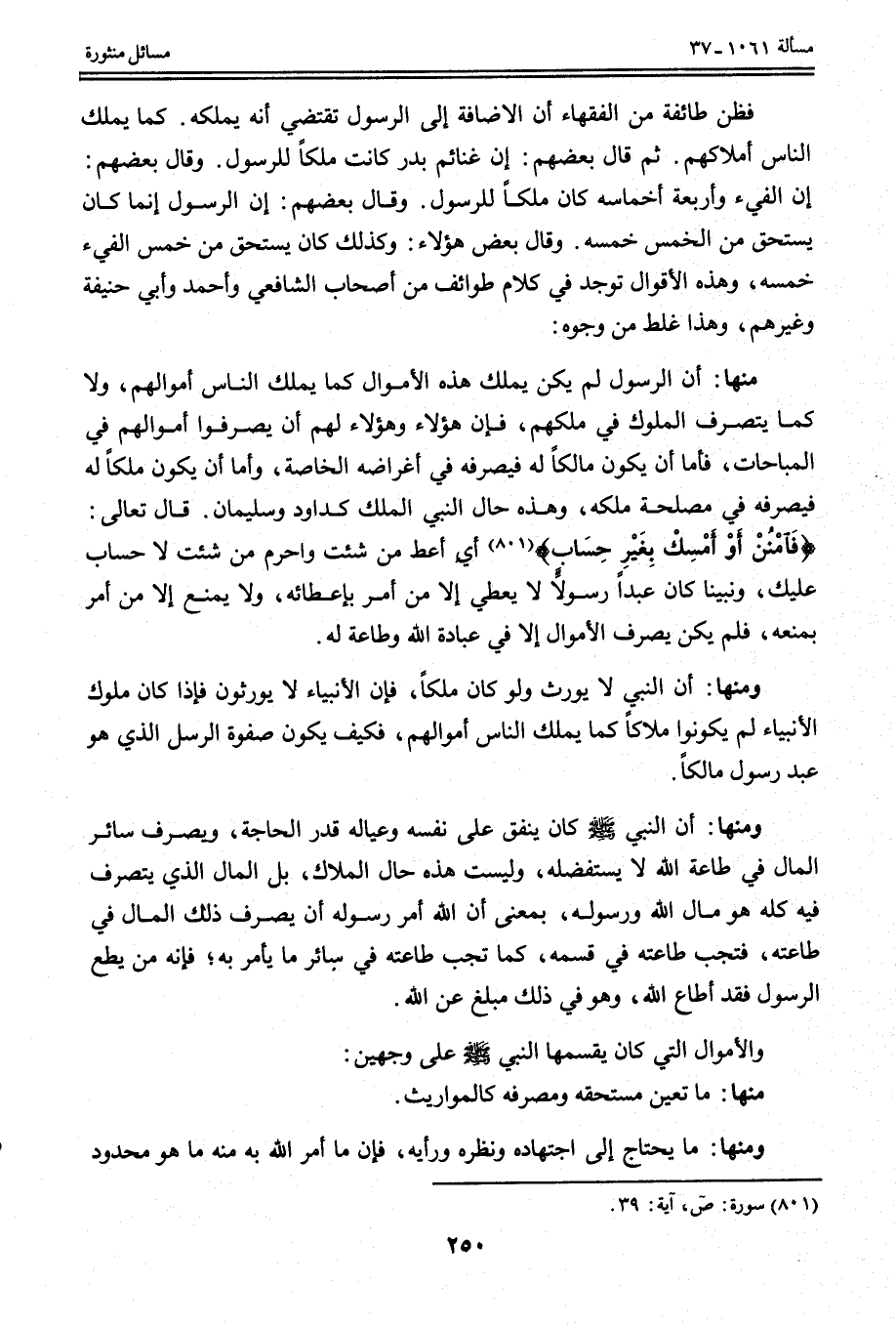 قَالَ تَعَالَى: {فَامْنُنْ أَوْ أَمْسِكْ بِغَيْرِ حِسَابٍ} [ص: 39] أَيْ أَعْطِ مَنْ شِئْت وَاحْرِمْ مَنْ شِئْت لَا حِسَابَ عَلَيْك، وَنَبِيُّنَا كَانَ عَبْدًا رَسُولًا لَا يُعْطِي إلَّا مَنْ أُمِرَ بِإِعْطَائِهِ، وَلَا يَمْنَعُ إلَّا مَنْ أُمِرَ بِمَنْعِهِ، فَلَمْ يَكُنْ يَصْرِفُ الْأَمْوَالَ إلَّا فِي عِبَادَةِ اللَّهِ وَطَاعَةٍ لَهُ.