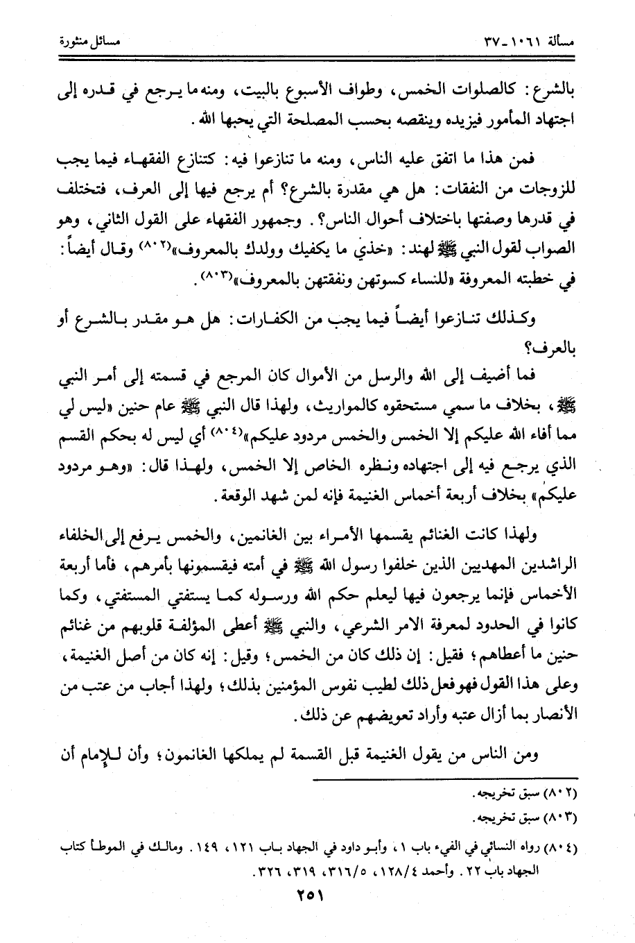 فَمِنْ هَذَا مَا اتَّفَقَ عَلَيْهِ النَّاسُ، وَمِنْهُ مَا تَنَازَعُوا فِيهِ: كَتَنَازُعِ الْفُقَهَاءِ فِيمَا يَجِبُ لِلزَّوْجَاتِ مِنْ النَّفَقَاتِ: هَلْ هِيَ مُقَدَّرَةٌ بِالشَّرْعِ؟ أَمْ يُرْجَعُ فِيهَا إلَى الْعُرْفِ، فَتَخْتَلِفُ فِي قَدْرِهَا وَصِفَتِهَا بِاخْتِلَافِ أَحْوَالِ النَّاسِ؟ .