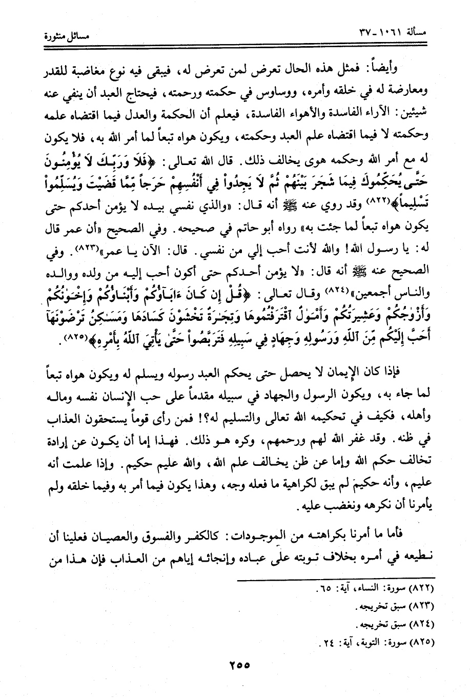 فَإِذَا كَانَ الْإِيمَانُ لَا يَحْصُلُ حَتَّى يُحَكِّمَ الْعَبْدُ رَسُولَهُ وَيُسَلِّمَ لَهُ وَيَكُونَ هَوَاهُ تَبَعًا لِمَا جَاءَ بِهِ، وَيَكُونَ الرَّسُولُ وَالْجِهَادُ فِي سَبِيلِهِ مُقَدَّمًا عَلَى حُبِّ الْإِنْسَانِ نَفْسِهِ وَمَالِهِ وَأَهْلِهِ، فَكَيْفَ فِي تَحْكِيمِهِ اللَّهَ تَعَالَى وَالتَّسْلِيمِ لَهُ؟ ، فَمَنْ رَأَى قَوْمًا يَسْتَحِقُّونَ الْعَذَابَ فِي ظَنِّهِ. وَقَدْ غَفَرَ اللَّهُ لَهُمْ وَرَحِمَهُمْ، وَكَرِهَ هُوَ ذَلِكَ. فَهَذَا إمَّا أَنْ يَكُونَ عَنْ إرَادَةٍ تُخَالِفُ حُكْمَ اللَّهِ وَإِمَّا عَنْ ظَنٍّ يُخَالِفُ عِلْمَ اللَّهِ، وَاَللَّهُ عَلِيمٌ حَكِيمٌ. وَإِذَا عَلِمْت أَنَّهُ عَلِيمٌ، وَأَنَّهُ حَكِيمٌ لَمْ يَبْقَ لِكَرَاهِيَةِ مَا فَعَلَهُ وَجْهٌ، وَهَذَا يَكُونُ فِيمَا أَمَرَ بِهِ وَفِيمَا خَلَقَهُ وَلَمْ يَأْمُرْنَا أَنْ نَكْرَهَهُ وَنَغْضَبَ عَلَيْهِ.
