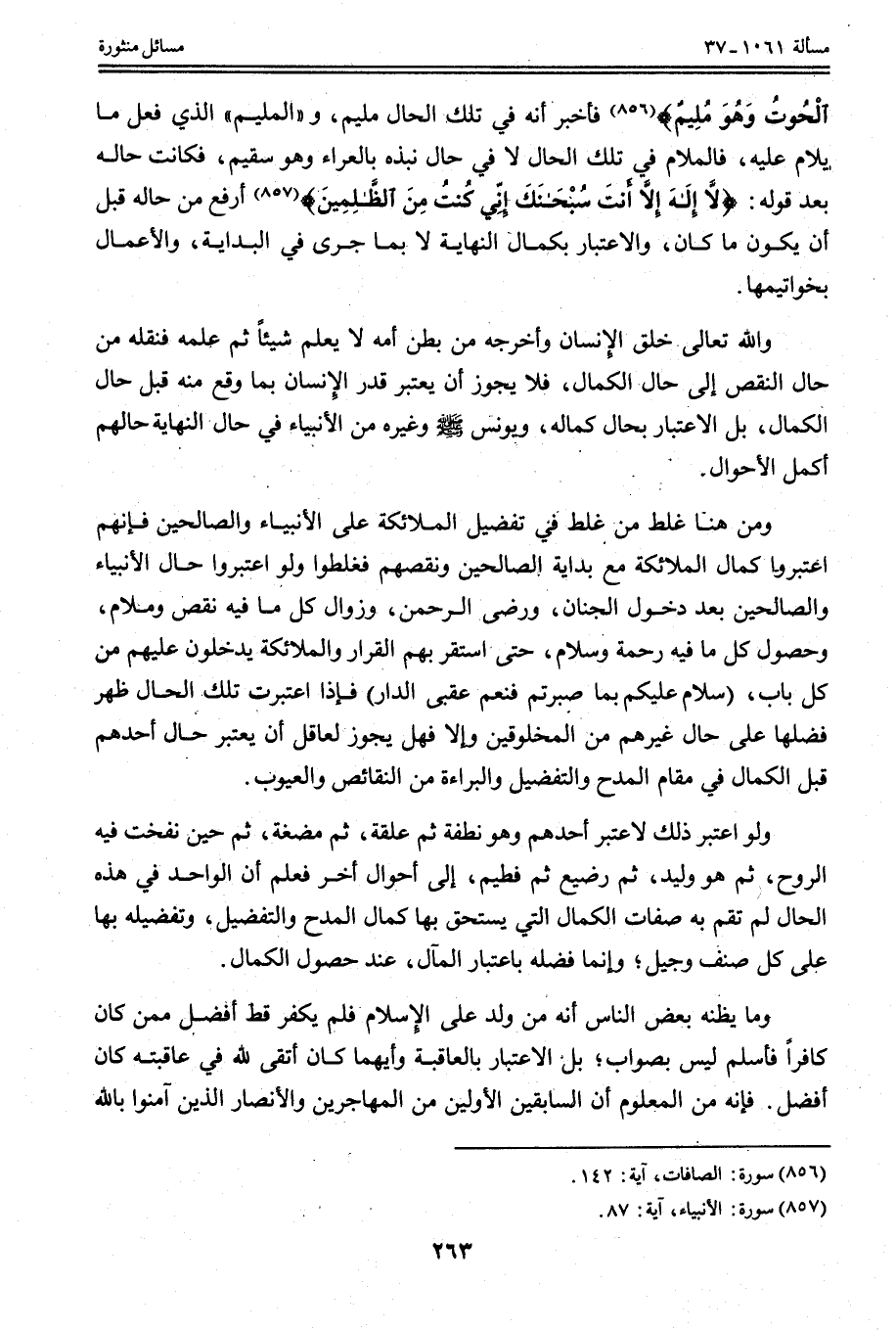 وَاَللَّهُ تَعَالَى خَلَقَ الْإِنْسَانَ وَأَخْرَجَهُ مِنْ بَطْنِ أُمِّهِ لَا يَعْلَمُ شَيْئًا ثُمَّ عَلَّمَهُ فَنَقَلَهُ مِنْ حَالِ النَّقْصِ إلَى حَالِ الْكَمَالِ، فَلَا يَجُوزُ أَنْ يُعْتَبَرَ قَدْرُ الْإِنْسَانِ بِمَا وَقَعَ مِنْهُ قَبْلَ حَالِ الْكَمَالِ، بَلْ الِاعْتِبَارُ بِحَالِ كَمَالِهِ، وَيُونُسُ - صَلَّى اللَّهُ عَلَيْهِ وَسَلَّمَ - وَغَيْرُهُ مِنْ الْأَنْبِيَاءِ فِي حَالِ النِّهَايَةِ حَالُهُمْ أَكْمَلُ الْأَحْوَالِ. وَمِنْ هُنَا غَلِطَ مِنْ غَلِطَ فِي تَفْضِيلِ الْمَلَائِكَةِ عَلَى الْأَنْبِيَاءِ وَالصَّالِحِينَ فَإِنَّهُمْ اعْتَبَرُوا كَمَالَ الْمَلَائِكَةِ مَعَ بِدَايَةِ الصَّالِحِينَ وَنَقْصِهِمْ فَغَلِطُوا وَلَوْ اعْتَبَرُوا حَالَ الْأَنْبِيَاءِ وَالصَّالِحِينَ بَعْدَ دُخُولِ الْجِنَانِ، وَرِضَا الرَّحْمَنِ، وَزَوَالِ كُلِّ مَا فِيهِ نَقْصٌ وَمَغْلَامٌ، وَحُصُولِ كُلِّ مَا فِيهِ رَحْمَةٌ وَسَلَامٌ، حَتَّى اسْتَقَرَّ بِهِمْ الْقَرَارُ وَالْمَلَائِكَةُ يَدْخُلُونَ عَلَيْهِمْ مِنْ كُلِّ بَابٍ، {سَلامٌ عَلَيْكُمْ بِمَا صَبَرْتُمْ فَنِعْمَ عُقْبَى الدَّارِ} [الرعد: 24] فَإِذَا اُعْتُبِرَتْ تِلْكَ الْحَالُ ظَهَرَ فَضْلُهَا عَلَى حَالِ غَيْرِهِمْ مِنْ الْمَخْلُوقِينَ وَإِلَّا فَهَلْ يَجُوزُ لِعَاقِلٍ أَنْ يَعْتَبِرَ حَالَ أَحَدِهِمْ قَبْلَ الْكَمَالِ فِي مَقَامِ الْمَدْحِ وَالتَّفْضِيلِ وَالْبَرَاءَةِ مِنْ النَّقَائِصِ وَالْعُيُوبِ.