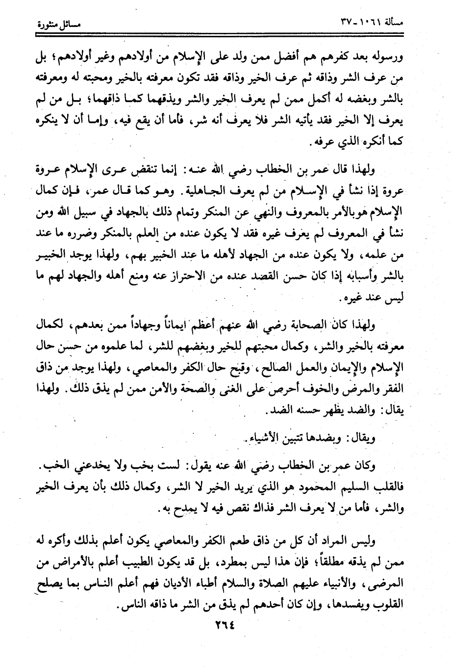 وَلِهَذَا قَالَ عُمَرُ بْنُ الْخَطَّابِ - رَضِيَ اللَّهُ عَنْهُ -: إنَّمَا تُنْقَضُ عُرَى الْإِسْلَامِ عُرْوَةً عُرْوَةً إذَا نَشَأَ فِي الْإِسْلَامِ مَنْ لَمْ يَعْرِفْ الْجَاهِلِيَّةَ. وَهُوَ كَمَا قَالَ عُمَرُ، فَإِنَّ كَمَالَ الْإِسْلَامِ هُوَ بِالْأَمْرِ بِالْمَعْرُوفِ وَالنَّهْيِ عَنْ الْمُنْكَرِ وَتَمَامُ ذَلِكَ بِالْجِهَادِ فِي سَبِيلِ اللَّهِ وَمَنْ نَشَأَ فِي الْمَعْرُوفِ لَمْ يَعْرِفْ غَيْرَهُ فَقَدْ لَا يَكُونُ عِنْدَهُ مَنْ الْعِلْمِ بِالْمُنْكَرِ وَضَرَرِهِ مَا عِنْدَ مَنْ عَلِمَهُ، وَلَا يَكُونُ عِنْدَهُ مِنْ الْجِهَادِ لِأَهْلِهِ مَا عِنْدَ الْخَبِيرِ بِهِمْ، وَلِهَذَا يُوجَدُ الْخَبِيرُ بِالشَّرِّ وَأَسْبَابِهِ إذَا كَانَ حُسْنُ الْقَصْدِ عِنْدَهُ مِنْ الِاحْتِرَازِ عَنْهُ وَمَنْعِ أَهْلِهِ وَالْجِهَادِ لَهُمْ مَا لَيْسَ عِنْدَ غَيْرِهِ.