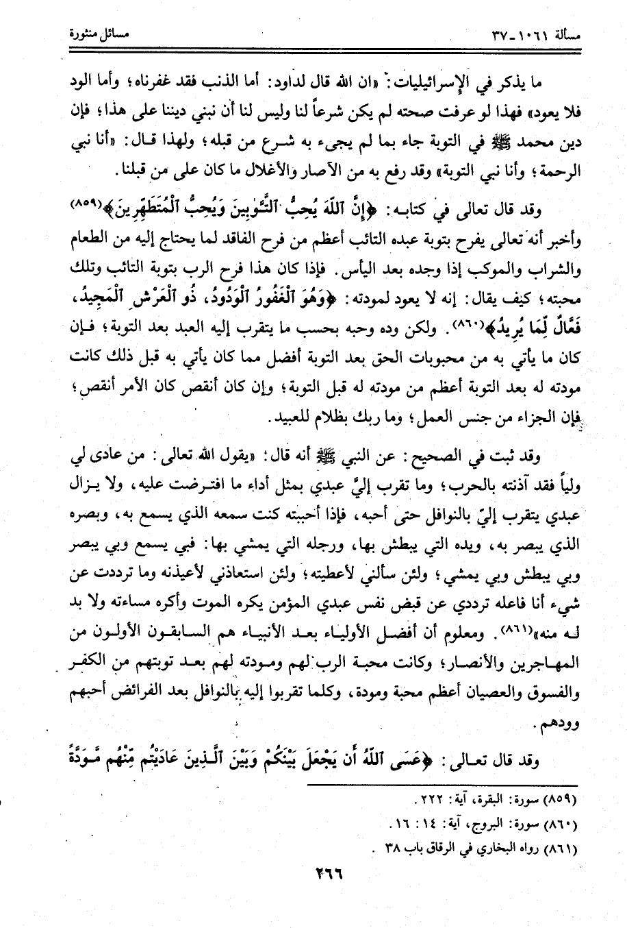 وَقَدْ قَالَ تَعَالَى فِي كِتَابِهِ: {إِنَّ اللَّهَ يُحِبُّ التَّوَّابِينَ وَيُحِبُّ الْمُتَطَهِّرِينَ} [البقرة: 222] وَأَخْبَرَ أَنَّهُ تَعَالَى يَفْرَحُ بِتَوْبَةِ عَبْدِهِ التَّائِبِ أَعْظَمَ مِنْ فَرَحِ الْفَاقِدِ لِمَا يَحْتَاجُ إلَيْهِ مِنْ الطَّعَامِ وَالشَّرَابِ وَالْمَوْكِبِ إذَا وَجَدَهُ بَعْدَ الْيَأْسِ. فَإِذَا كَانَ هَذَا فَرَحَ الرَّبِّ بِتَوْبَةِ التَّائِبِ وَتِلْكَ مَحَبَّتَهُ؛ كَيْفَ يُقَالُ: إنَّهُ لَا يَعُودُ لِمَوَدَّتِهِ: {وَهُوَ الْغَفُورُ الْوَدُودُ} [البروج: 14] {ذُو الْعَرْشِ الْمَجِيدُ} [البروج: 15] {فَعَّالٌ لِمَا يُرِيدُ} [البروج: 16] . وَلَكِنَّ وُدَّهُ وَحُبَّهُ بِحَسَبِ مَا يَتَقَرَّبُ إلَيْهِ الْعَبْدُ بَعْدَ التَّوْبَةِ؛ فَإِنْ كَانَ مَا يَأْتِي بِهِ مِنْ مَحْبُوبَاتِ الْحَقِّ بَعْدَ التَّوْبَةِ أَفْضَلَ مِمَّا كَانَ يَأْتِي بِهِ قَبْلَ ذَلِكَ كَانَتْ مَوَدَّتُهُ لَهُ بَعْدَ التَّوْبَةِ أَعْظَمَ مِنْ مَوَدَّتِهِ لَهُ قَبْلَ التَّوْبَةِ؛ وَإِنْ كَانَ أَنْقَصَ كَانَ الْأَمْرُ أَنْقَصَ؛ فَإِنَّ الْجَزَاءَ مِنْ جِنْسِ الْعَمَلِ؛ وَمَا رَبُّك بِظَلَّامٍ لِلْعَبِيدِ.