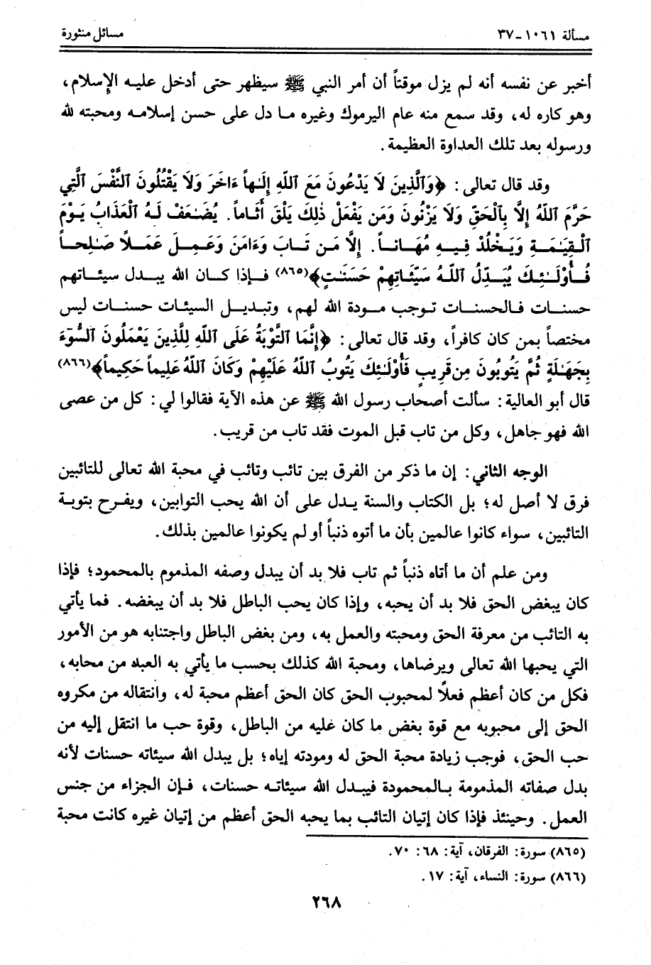 وَقَدْ قَالَ تَعَالَى: {وَالَّذِينَ لا يَدْعُونَ مَعَ اللَّهِ إِلَهًا آخَرَ وَلا يَقْتُلُونَ النَّفْسَ الَّتِي حَرَّمَ اللَّهُ إِلا بِالْحَقِّ وَلا يَزْنُونَ وَمَنْ يَفْعَلْ ذَلِكَ يَلْقَ أَثَامًا} [الفرقان: 68] {يُضَاعَفْ لَهُ الْعَذَابُ يَوْمَ الْقِيَامَةِ وَيَخْلُدْ فِيهِ مُهَانًا} [الفرقان: 69] {إِلا مَنْ تَابَ وَآمَنَ وَعَمِلَ عَمَلا صَالِحًا فَأُولَئِكَ يُبَدِّلُ اللَّهُ سَيِّئَاتِهِمْ حَسَنَاتٍ} [الفرقان: 70] فَإِذَا كَانَ اللَّهُ يُبَدِّلُ سَيِّئَاتِهِمْ حَسَنَاتٍ فَالْحَسَنَاتُ تُوجِبُ مَوَدَّةَ اللَّهِ لَهُمْ، وَتَبْدِيلُ السَّيِّئَاتِ حَسَنَاتٍ لَيْسَ مُخْتَصًّا بِمَنْ كَانَ كَافِرًا، وَقَدْ قَالَ تَعَالَى: {إِنَّمَا التَّوْبَةُ عَلَى اللَّهِ لِلَّذِينَ يَعْمَلُونَ السُّوءَ بِجَهَالَةٍ ثُمَّ يَتُوبُونَ مِنْ قَرِيبٍ فَأُولَئِكَ يَتُوبُ اللَّهُ عَلَيْهِمْ وَكَانَ اللَّهُ عَلِيمًا حَكِيمًا} [النساء: 17] قَالَ أَبُو الْعَالِيَةِ: سَأَلْت أَصْحَابَ رَسُولِ اللَّهِ - صَلَّى اللَّهُ عَلَيْهِ وَسَلَّمَ - عَنْ هَذِهِ الْآيَةِ فَقَالُوا لِي: كُلُّ مَنْ عَصَى اللَّهَ فَهُوَ جَاهِلٌ، وَكُلٌّ مَنْ تَابَ قَبْلَ الْمَوْتِ فَقَدْ تَابَ مِنْ قَرِيبٍ.