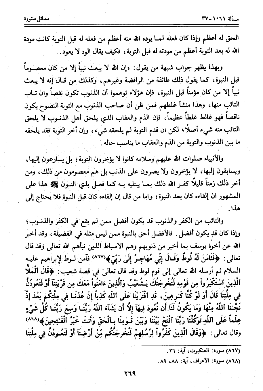 وَبِهَذَا يَظْهَرُ جَوَابُ شُبْهَةِ مَنْ يَقُولُ: " إنَّ اللَّهَ لَا يَبْعَثُ نَبِيًّا إلَّا مَنْ كَانَ مَعْصُومًا قَبْلَ النُّبُوَّةِ، كَمَا يَقُولُ ذَلِكَ طَائِفَةٌ مِنْ الرَّافِضَةِ وَغَيْرِهِمْ، وَكَذَلِكَ مَنْ قَالَ إنَّهُ لَا يَبْعَثُ نَبِيًّا إلَّا مَنْ كَانَ مُؤْمِنًا قَبْلَ النُّبُوَّةِ، فَإِنَّ هَؤُلَاءِ تَوَهَّمُوا أَنَّ الذُّنُوبَ تَكُونُ نَقْصًا وَإِنْ تَابَ التَّائِبُ مِنْهَا، وَهَذَا مَنْشَأُ غَلَطِهِمْ فَمَنْ ظَنَّ أَنَّ صَاحِبَ الذُّنُوبِ مَعَ التَّوْبَةِ النَّصُوحِ يَكُونُ نَاقِصًا فَهُوَ غَالِطٌ غَلَطًا عَظِيمًا، فَإِنَّ الذَّمَّ وَالْعِقَابَ الَّذِي يَلْحَقُ أَهْلَ الذُّنُوبِ لَا يَلْحَقُ التَّائِبَ مِنْهُ شَيْءٌ أَصْلًا؛ لَكِنْ إنْ قَدَّمَ التَّوْبَةَ لَمْ يَلْحَقْهُ شَيْءٌ، وَإِنْ أَخَّرَ التَّوْبَةَ فَقَدْ يَلْحَقُهُ مَا بَيْنَ الذُّنُوبِ وَالتَّوْبَةِ مِنْ الذَّمِّ وَالْعِقَابِ مَا يُنَاسِبُ.