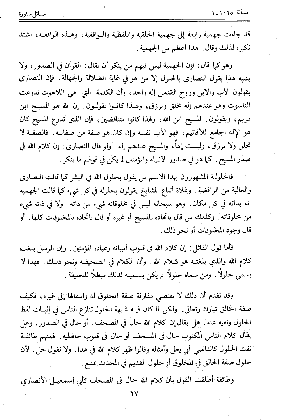 هَلْ يُقَالُ إنَّ كَلَامَ اللَّهِ حَالٌّ فِي الْمُصْحَفِ.