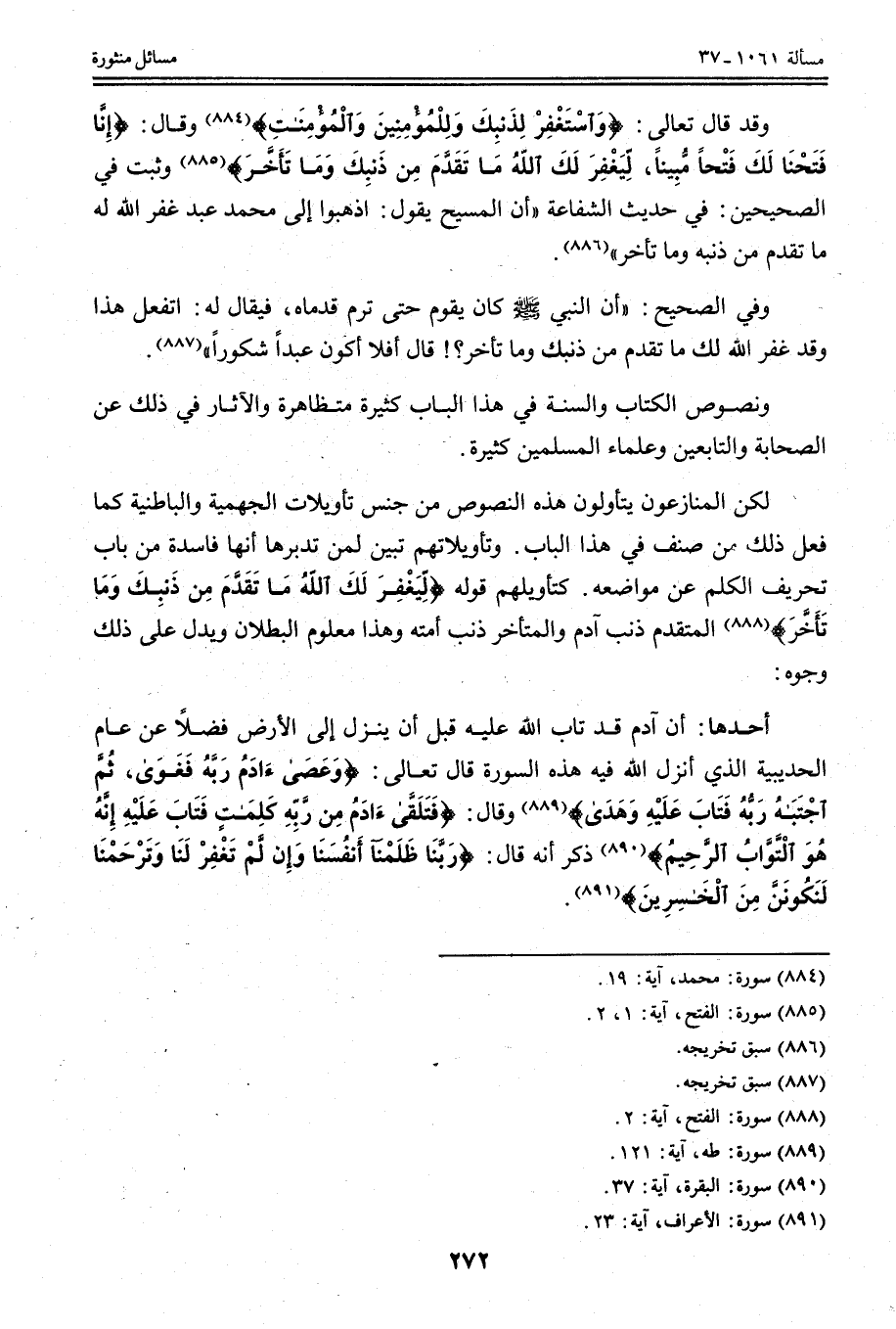 لَكِنْ الْمُنَازِعُونَ يَتَأَوَّلُونَ هَذِهِ النُّصُوصَ مِنْ جِنْسِ تَأْوِيلَاتِ الْجَهْمِيَّةِ وَالْبَاطِنِيَّةِ كَمَا فَعَلَ ذَلِكَ مَنْ صَنَّفَ فِي هَذَا الْبَابِ. وَتَأْوِيلَاتُهُمْ تُبَيِّنُ لِمَنْ تَدَبَّرَهَا أَنَّهَا فَاسِدَةٌ مِنْ بَابِ تَحْرِيفِ الْكَلِمِ عَنْ مَوَاضِعِهِ. كَتَأْوِيلِهِمْ قَوْلَهُ {لِيَغْفِرَ لَكَ اللَّهُ مَا تَقَدَّمَ مِنْ ذَنْبِكَ وَمَا تَأَخَّرَ} [الفتح: 2] الْمُتَقَدِّمُ ذَنْبُ آدَمَ وَالْمُتَأَخِّرُ ذَنْبُ أُمَّتِهِ وَهَذَا مَعْلُومُ الْبُطْلَانِ وَيَدُلُّ عَلَى ذَلِكَ وُجُوهٌ: أَحَدُهَا: أَنَّ آدَمَ قَدْ تَابَ اللَّهُ عَلَيْهِ قَبْلَ أَنْ يَنْزِلَ إلَى الْأَرْضِ فَضْلًا عَنْ عَامِ الْحُدَيْبِيَةِ الَّذِي أَنْزَلَ اللَّهُ فِيهِ هَذِهِ السُّورَةَ قَالَ تَعَالَى: {وَعَصَى آدَمُ رَبَّهُ فَغَوَى} [طه: 121] {ثُمَّ اجْتَبَاهُ رَبُّهُ فَتَابَ عَلَيْهِ وَهَدَى} [طه: 122] وَقَالَ: {فَتَلَقَّى آدَمُ مِنْ رَبِّهِ كَلِمَاتٍ فَتَابَ عَلَيْهِ إِنَّهُ هُوَ التَّوَّابُ الرَّحِيمُ} [البقرة: 37] ذَكَرَ أَنَّهُ قَالَ: {رَبَّنَا ظَلَمْنَا أَنْفُسَنَا وَإِنْ لَمْ تَغْفِرْ لَنَا وَتَرْحَمْنَا لَنَكُونَنَّ مِنَ الْخَاسِرِينَ} [الأعراف: 23] .