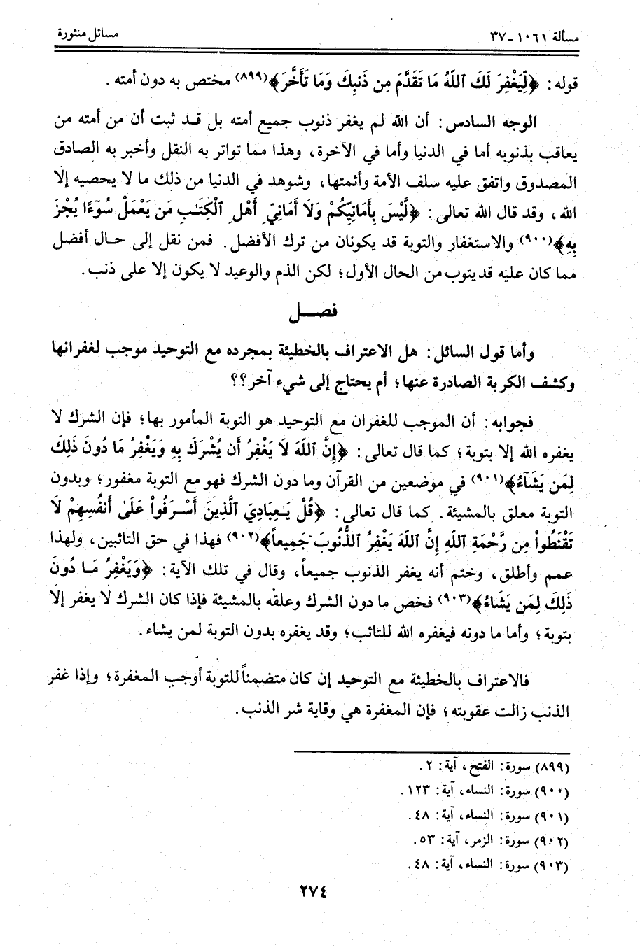 فَصْلٌ وَأَمَّا قَوْلُ السَّائِلِ: هَلْ الِاعْتِرَافُ بِالْخَطِيئَةِ بِمُجَرَّدِهِ مَعَ التَّوْحِيدِ مُوجِبٌ لِغُفْرَانِهَا وَكَشْفِ الْكُرْبَةِ الصَّادِرَةِ عَنْهَا؛ أَمْ يَحْتَاجُ إلَى شَيْءٍ آخَرَ؟ فَجَوَابُهُ: أَنَّ الْمُوجِبَ لِلْغُفْرَانِ مَعَ التَّوْحِيدِ هُوَ التَّوْبَةُ الْمَأْمُورُ بِهَا؛ فَإِنَّ الشِّرْكَ لَا يَغْفِرُهُ اللَّهُ إلَّا بِتَوْبَةٍ؛ كَمَا قَالَ تَعَالَى: {إِنَّ اللَّهَ لا يَغْفِرُ أَنْ يُشْرَكَ بِهِ وَيَغْفِرُ مَا دُونَ ذَلِكَ لِمَنْ يَشَاءُ} [النساء: 48] فِي مَوْضِعَيْنِ مِنْ الْقُرْآنِ وَمَا دُونَ الشِّرْكِ فَهُوَ مَعَ التَّوْبَةِ مَغْفُورٌ؛ وَبِدُونِ التَّوْبَةِ مُعَلَّقٌ بِالْمَشِيئَةِ. كَمَا قَالَ تَعَالَى: {قُلْ يَا عِبَادِيَ الَّذِينَ أَسْرَفُوا عَلَى أَنْفُسِهِمْ لا تَقْنَطُوا مِنْ رَحْمَةِ اللَّهِ إِنَّ اللَّهَ يَغْفِرُ الذُّنُوبَ جَمِيعًا} [الزمر: 53] فَهَذَا فِي حَقِّ التَّائِبِينَ، وَلِهَذَا عَمَّمَ وَأَطْلَقَ، وَخَتَمَ أَنَّهُ يَغْفِرُ الذُّنُوبَ جَمِيعًا، وَقَالَ فِي تِلْكَ الْآيَةِ: {وَيَغْفِرُ مَا دُونَ ذَلِكَ لِمَنْ يَشَاءُ} [النساء: 48] فَخَصَّ مَا دُونَ الشِّرْكِ وَعَلَّقَهُ بِالْمَشِيئَةِ فَإِذَا كَانَ الشِّرْكُ لَا يُغْفَرُ إلَّا بِتَوْبَةٍ؛ وَأَمَّا مَا دُونَهُ فَيَغْفِرُهُ اللَّهُ لِلتَّائِبِ؛ وَقَدْ يَغْفِرُهُ بِدُونِ التَّوْبَةِ لِمَنْ يَشَاءُ.