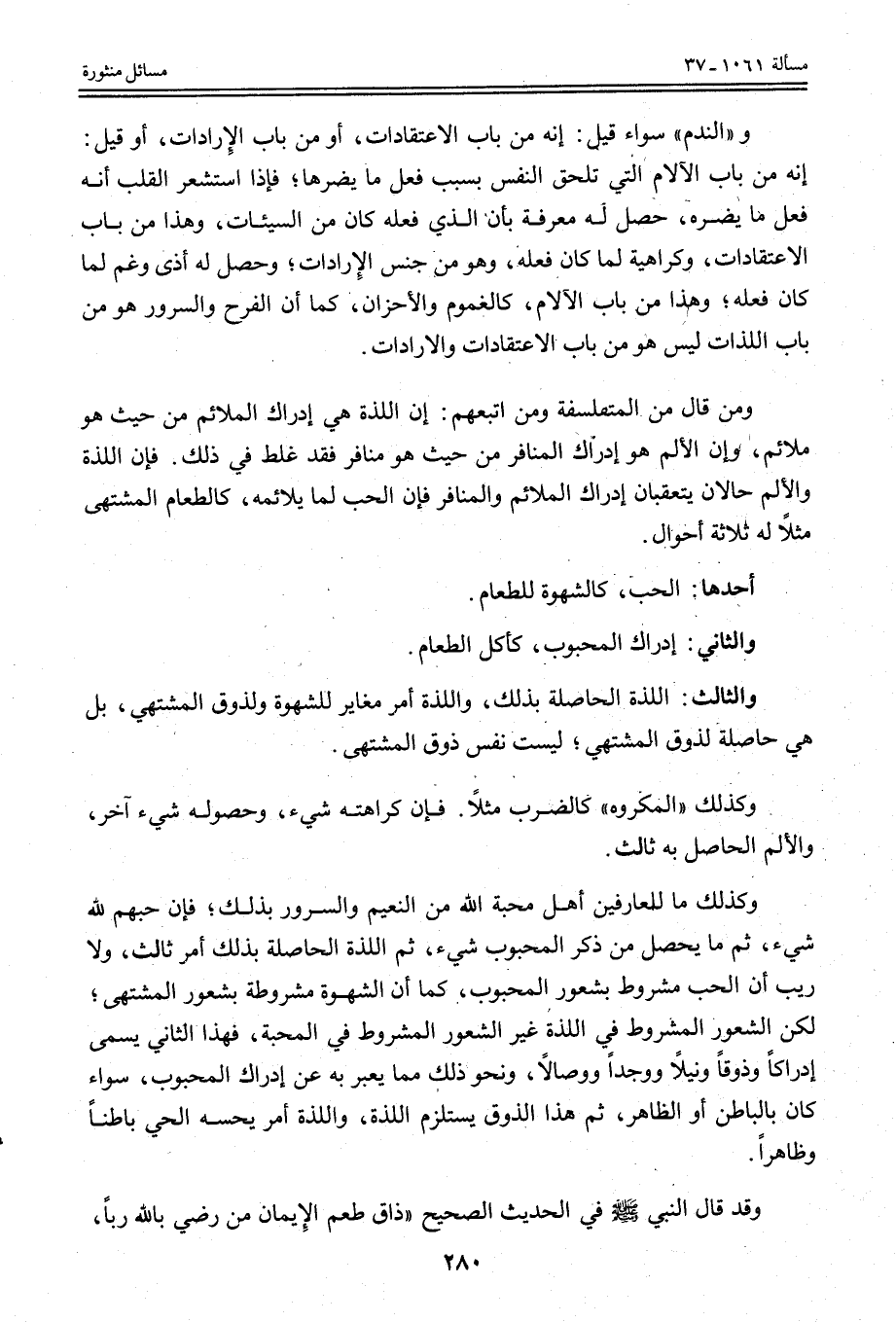 " وَالنَّدَمُ " سَوَاءٌ قِيلَ: إنَّهُ مِنْ بَابِ الِاعْتِقَادَاتِ، أَوْ مِنْ بَابِ الْإِرَادَاتِ، أَوْ قِيلَ: إنَّهُ مِنْ بَابِ الْآلَامِ الَّتِي تَلْحَقُ النَّفْسَ بِسَبَبِ فِعْلِ مَا يَضُرُّهَا؛ فَإِذَا اسْتَشْعَرَ الْقَلْبُ أَنَّهُ فَعَلَ مَا يَضُرُّهُ، حَصَلَ لَهُ مَعْرِفَةٌ بِأَنَّ الَّذِي فَعَلَهُ كَانَ مِنْ السَّيِّئَاتِ، وَهَذَا مِنْ بَابِ الِاعْتِقَادَاتِ، وَكَرَاهِيَةٌ لِمَا كَانَ فَعَلَهُ، وَهُوَ مِنْ جِنْسِ الْإِرَادَاتِ؛ وَحَصَلَ لَهُ أَذًى وَغَمٌّ لِمَا كَانَ فَعَلَهُ؛ وَهَذَا مِنْ بَابِ الْآلَامِ، كَالْغُمُومِ وَالْأَحْزَانِ، كَمَا أَنَّ الْفَرَحَ وَالسُّرُورَ هُوَ مِنْ بَابِ اللَّذَّاتِ لَيْسَ هُوَ مِنْ بَابِ الِاعْتِقَادَاتِ وَالْإِرَادَاتِ. وَمَنْ قَالَ مِنْ الْمُتَفَلْسِفَةِ وَمَنْ اتَّبَعَهُمْ: إنَّ اللَّذَّةَ هِيَ إدْرَاكُ الْمُلَائِمِ مِنْ حَيْثُ هُوَ مُلَائِمٌ، وَإِنَّ الْأَلَمَ هُوَ إدْرَاكُ الْمُنَافِرِ مِنْ حَيْثُ هُوَ مُنَافِرٌ فَقَدْ غَلِطَ فِي ذَلِكَ. فَإِنَّ اللَّذَّةَ وَالْأَلَمَ حَالَانِ يَتَعَقَّبَانِ إدْرَاكَ الْمُلَائِمِ وَالْمُنَافِرِ فَإِنَّ الْحُبَّ لِمَا يُلَائِمُهُ، كَالطَّعَامِ الْمُشْتَهَى مَثَلًا لَهُ ثَلَاثَةُ أَحْوَالٍ.