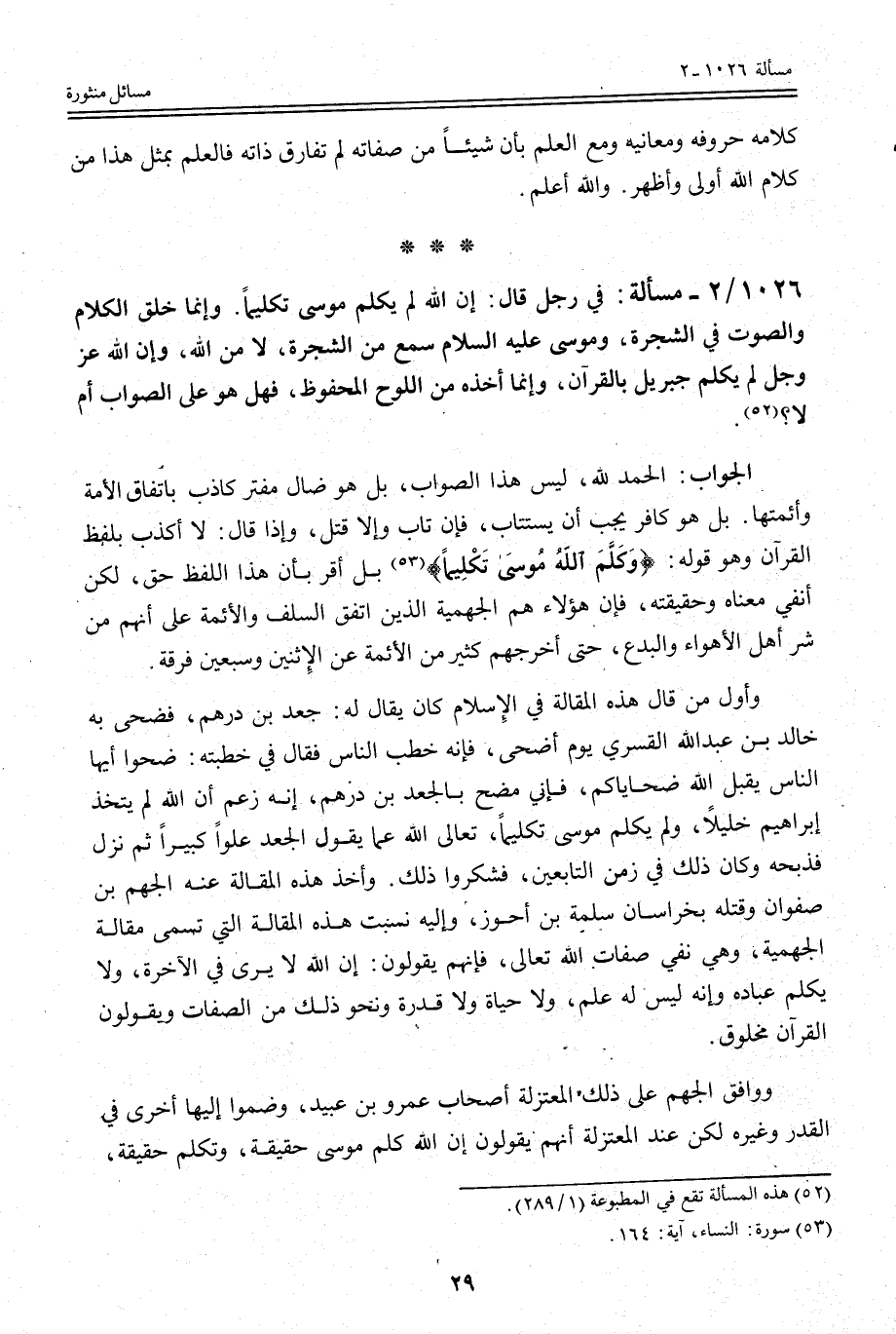 فِي رَجُلٍ قَالَ: إنَّ اللَّهَ لَمْ يُكَلِّمْ مُوسًى تَكْلِيمًا. وَإِنَّمَا خَلَقَ الْكَلَامَ وَالصَّوْتَ فِي الشَّجَرَةِ، وَمُوسَى - عَلَيْهِ السَّلَامُ - سَمِعَ مِنْ الشَّجَرَةِ، لَا مِنْ اللَّهِ، وَإِنَّ اللَّهَ عَزَّ وَجَلَّ لَمْ يُكَلِّمْ جِبْرِيلُ بِالْقُرْآنِ، وَإِنَّمَا أَخَذَهُ مِنْ اللَّوْحِ الْمَحْفُوظِ، فَهَلْ هُوَ عَلَى الصَّوَابِ أَمْ لَا؟