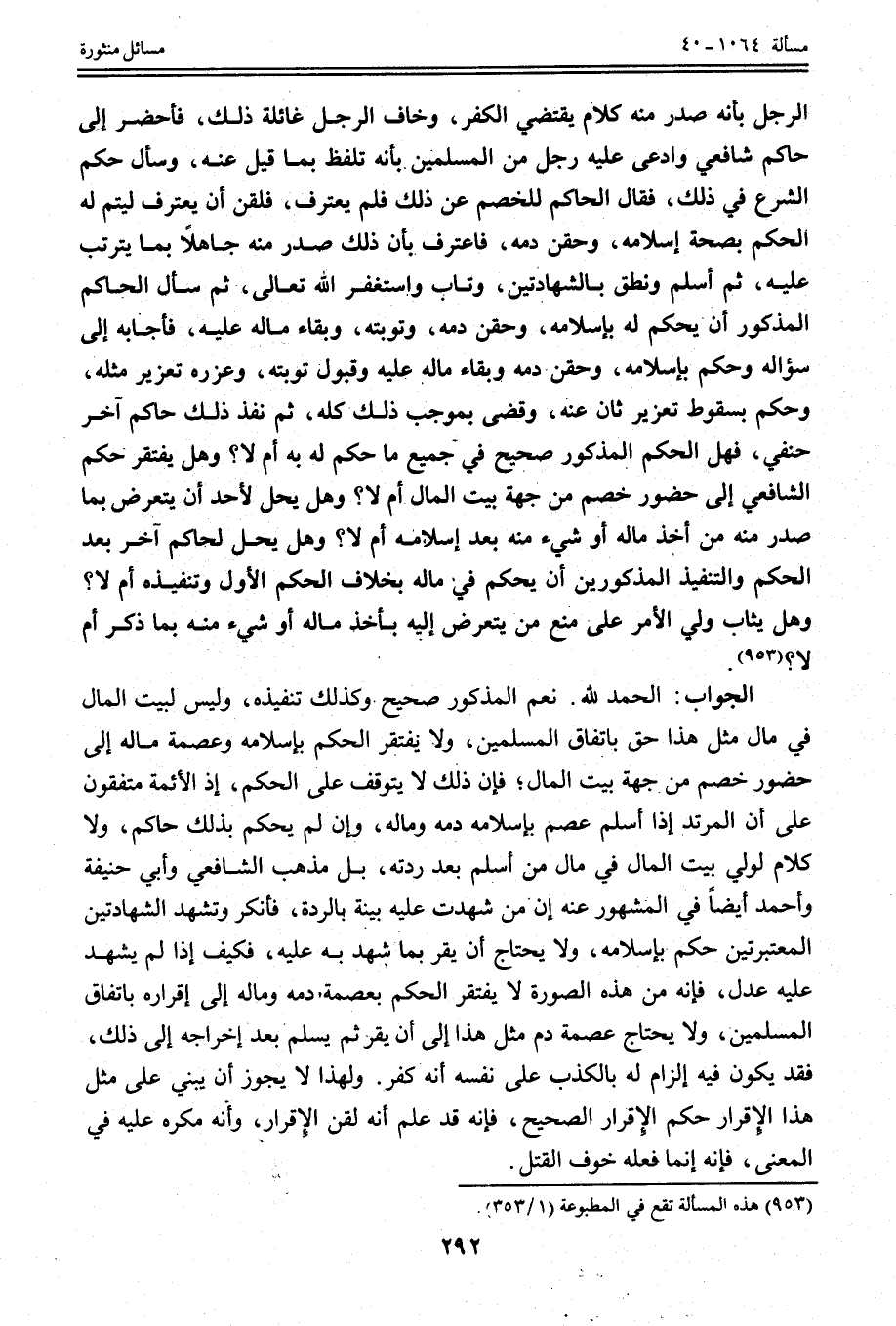 الْجَوَابُ: الْحَمْدُ لِلَّهِ. نَعَمْ الْمَذْكُورُ صَحِيحٌ وَكَذَلِكَ تَنْفِيذُهُ، وَلَيْسَ لِبَيْتِ الْمَالِ فِي مَالٍ مِثْلِ هَذَا حَقٌّ بِاتِّفَاقِ الْمُسْلِمِينَ، وَلَا يَفْتَقِرُ الْحُكْمُ بِإِسْلَامِهِ وَعِصْمَةِ مَالِهِ إلَى حُضُورِ خَصْمٍ مِنْ جِهَةِ بَيْتِ الْمَالِ؛ فَإِنَّ ذَلِكَ لَا يَتَوَقَّفُ عَلَى الْحُكْمِ، إذْ الْأَئِمَّةُ مُتَّفِقُونَ عَلَى أَنَّ الْمُرْتَدَّ إذَا أَسْلَمَ عَصَمَ بِإِسْلَامِهِ دَمَهُ وَمَالَهُ، وَإِنْ لَمْ يَحْكُمْ بِذَلِكَ حَاكِمٌ، وَلَا كَلَامَ لِوَلِيِّ بَيْتِ الْمَالِ فِي مَالِ مَنْ أَسْلَمَ بَعْدَ رِدَّتِهِ، بَلْ مَذْهَبُ الشَّافِعِيِّ وَأَبِي حَنِيفَةَ وَأَحْمَدَ أَيْضًا فِي الْمَشْهُورِ عَنْهُ أَنَّ مَنْ شَهِدَتْ عَلَيْهِ بَيِّنَةٌ بِالرِّدَّةِ، فَأَنْكَرَ وَتَشَهَّدَ الشَّهَادَتَيْنِ الْمُعْتَبَرَتَيْنِ حُكِمَ بِإِسْلَامِهِ، وَلَا يَحْتَاجُ أَنْ يُقِرَّ بِمَا شَهِدَ بِهِ عَلَيْهِ، فَكَيْفَ إذَا لَمْ يَشْهَدْ عَلَيْهِ عَدْلٌ، فَإِنَّهُ مِنْ هَذِهِ الصُّورَةِ لَا يَفْتَقِرُ الْحُكْمُ بِعِصْمَةِ دَمِهِ وَمَالِهِ إلَى إقْرَارِهِ بِاتِّفَاقِ الْمُسْلِمِينَ، وَلَا يَحْتَاجُ عِصْمَةُ دَمِ مِثْلِ هَذَا إلَى أَنْ يُقِرَّ ثُمَّ يُسْلِمَ بَعْدَ إخْرَاجِهِ إلَى ذَلِكَ، فَقَدْ يَكُونُ فِيهِ إلْزَامٌ لَهُ بِالْكَذِبِ عَلَى نَفْسِهِ أَنَّهُ كُفْرٌ. وَلِهَذَا لَا يَجُوزُ أَنْ يَبْنِيَ عَلَى مِثْلِ هَذَا الْإِقْرَارِ حُكْمَ الْإِقْرَارِ الصَّحِيحِ، فَإِنَّهُ قَدْ عَلِمَ أَنَّهُ لُقِّنَ الْإِقْرَارَ، وَأَنَّهُ مُكْرَهٌ عَلَيْهِ فِي الْمَعْنَى، فَإِنَّهُ إنَّمَا فَعَلَهُ خَوْفَ الْقَتْلِ.