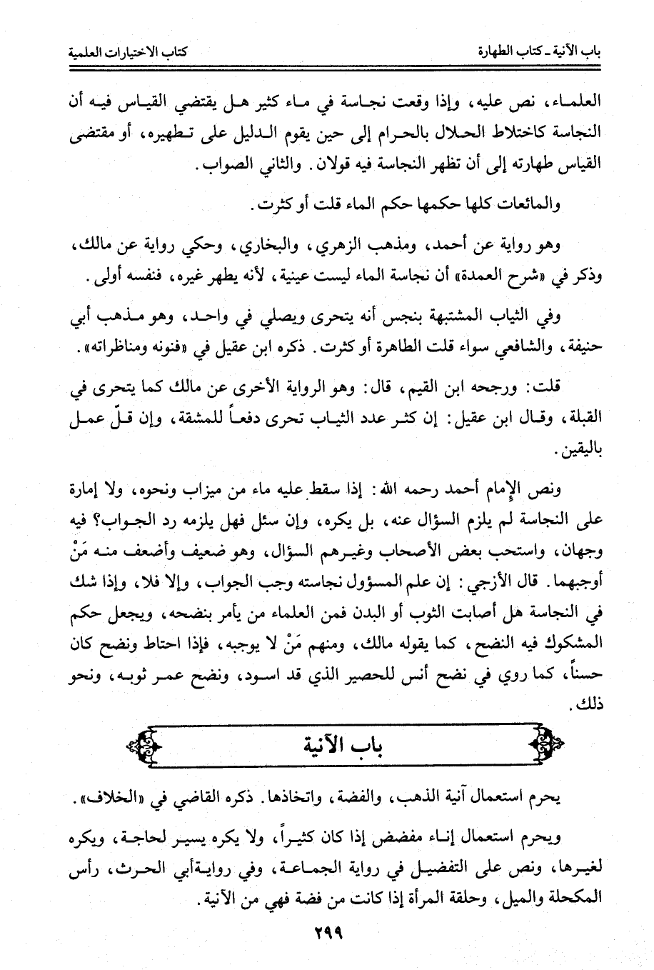 الْعُلَمَاءِ، نَصَّ عَلَيْهِ، وَإِذَا وَقَعَتْ نَجَاسَةٌ فِي مَاءٍ كَثِيرٍ هَلْ يَقْتَضِي الْقِيَاسُ فِيهِ أَنَّ النَّجَاسَةَ كَاخْتِلَاطِ الْحَلَالِ بِالْحَرَامِ إلَى حِينِ يَقُومُ الدَّلِيلُ عَلَى تَطْهِيرِهِ، أَوْ مُقْتَضَى الْقِيَاسِ طَهَارَتُهُ إلَى أَنْ تَظْهَرَ النَّجَاسَةُ فِيهِ قَوْلَانِ. وَالثَّانِي الصَّوَابُ. وَالْمَائِعَاتُ كُلُّهَا حُكْمُهَا حُكْمُ الْمَاءِ قَلَّتْ أَوْ كَثُرَتْ.