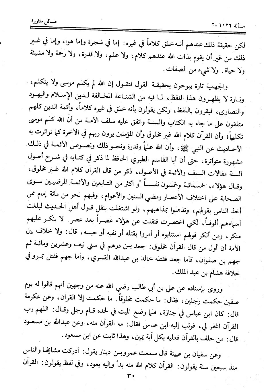 وَالْجَهْمِيَّةُ تَارَةً يَبُوحُونَ بِحَقِيقَةِ الْقَوْلِ فَتَقُولُ إنَّ اللَّهَ لَمْ يُكَلِّمْ مُوسَى وَلَا يَتَكَلَّمُ، وَتَارَةً لَا يُظْهِرُونَ هَذَا اللَّفْظَ، لِمَا فِيهِ مِنْ الشَّنَاعَةِ الْمُخَالِفَةِ لِدِينِ الْإِسْلَامِ وَالْيَهُودِ وَالنَّصَارَى، فَيُقِرُّونَ بِاللَّفْظِ، وَلَكِنْ يَقُولُونَ بِأَنَّهُ خَلَقَ فِي غَيْرِهِ كَلَامًا، وَأَئِمَّةُ الدِّينِ كُلُّهُمْ مُتَّفِقُونَ عَلَى مَا جَاءَ بِهِ الْكِتَابُ وَالسُّنَّةُ وَاتَّفَقَ عَلَيْهِ سَلَفُ الْأُمَّةِ مِنْ أَنَّ اللَّهَ كَلَّمَ مُوسَى تَكْلِيمًا؛ وَأَنَّ الْقُرْآنَ كَلَامُ اللَّهِ غَيْرُ مَخْلُوقٍ وَأَنَّ الْمُؤْمِنِينَ يَرَوْنَ رَبَّهُمْ فِي الْآخِرَةِ كَمَا تَوَاتَرَتْ بِهِ الْأَحَادِيثُ عَنْ النَّبِيِّ - صَلَّى اللَّهُ عَلَيْهِ وَسَلَّمَ - وَأَنَّ لِلَّهِ عِلْمًا وَقُدْرَةً وَنَحْوَ ذَلِكَ وَنُصُوصُ الْأَئِمَّةِ فِي ذَلِكَ مَشْهُورَةٌ مُتَوَاتِرَةٌ، حَتَّى إنَّ أَبَا الْقَاسِمِ الطَّبَرِيَّ الْحَافِظَ لَمَّا ذَكَرَ فِي كِتَابِهِ فِي شَرْحِ أُصُولِ السُّنَّةِ مَقَالَاتِ السَّلَفِ وَالْأَئِمَّةِ فِي الْأُصُولِ، ذَكَرَ مَنْ قَالَ الْقُرْآنُ كَلَامُ اللَّهِ غَيْرُ مَخْلُوقٍ، وَقَالَ هَؤُلَاءِ، خَمْسُمِائَةٍ وَخَمْسُونَ نَفْسًا أَوْ أَكْثَرُ مِنْ التَّابِعِينَ وَالْأَئِمَّةِ الْمَرَضِيِّينَ سِوَى الصَّحَابَةِ عَلَى اخْتِلَافِ الْأَعْصَارِ وَمُضِيِّ السِّنِينَ وَالْأَعْوَامِ، وَفِيهِمْ نَحْوٌ مِنْ مِائَةِ إمَامٍ مِمَّنْ أَخَذَ النَّاسُ بِقَوْلِهِمْ، وَتَذَهَّبُوا بِمَذَاهِبِهِمْ، وَلَوْ اشْتَغَلْت بِنَقْلِ قَوْلِ أَهْلِ الْحَدِيثِ لَبَلَغَتْ أَسْمَاؤُهُمْ أُلُوفًا، لَكِنِّي اخْتَصَرْت فَنَقَلْت عَنْ هَؤُلَاءِ عَصْرًا بَعْدَ عَصْرٍ.