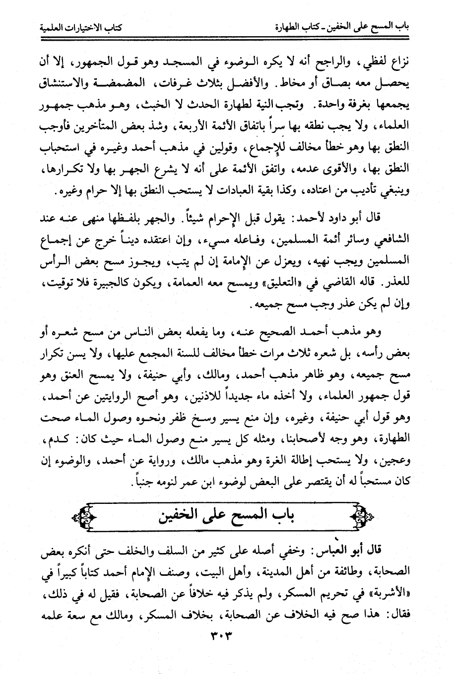 وَهُوَ مَذْهَبُ أَحْمَدَ الصَّحِيحُ عَنْهُ، وَمَا يَفْعَلُهُ بَعْضُ النَّاسِ مِنْ مَسْحِ شَعْرِهِ أَوْ بَعْضِ رَأْسِهِ، بَلْ شَعْرِهِ ثَلَاثَ مَرَّاتٍ خَطَأٌ مُخَالِفٌ لِلسُّنَّةِ الْمُجْمَعِ عَلَيْهَا، وَلَا يُسَنُّ تَكْرَارُ مَسْحِ جَمِيعِهِ، وَهُوَ ظَاهِرُ مَذْهَبِ أَحْمَدَ، وَمَالِكٍ، وَأَبِي حَنِيفَةَ، وَلَا يَمْسَحُ الْعُنُقَ وَهُوَ قَوْلُ جُمْهُورِ الْعُلَمَاءِ، وَلَا أَخْذُهُ مَاءً جَدِيدًا لِلْأُذُنَيْنِ، وَهُوَ أَصَحُّ الرِّوَايَتَيْنِ عَنْ أَحْمَدَ، وَهُوَ قَوْلُ أَبِي حَنِيفَةَ، وَغَيْرِهِ، وَإِنْ مَنَعَ يَسِيرُ وَسَخِ ظُفْرٍ وَنَحْوِهِ وُصُولَ الْمَاءِ صَحَّتْ الطَّهَارَةُ، وَهُوَ وَجْهٌ لِأَصْحَابِنَا، وَمِثْلُهُ كُلُّ يَسِيرٍ مَنَعَ وُصُولَ الْمَاءِ حَيْثُ كَانَ: كَدَمٍ، وَعَجِينٍ، وَلَا يُسْتَحَبُّ إطَالَةُ الْغُرَّةِ وَهُوَ مَذْهَبُ مَالِكٍ، وَرِوَايَةٌ عَنْ أَحْمَدَ، وَالْوُضُوءُ إنْ كَانَ مُسْتَحَبًّا لَهُ أَنْ يَقْتَصِرَ عَلَى الْبَعْضِ لِوُضُوءِ ابْنِ عُمَرَ لِنَوْمِهِ جُنُبًا.