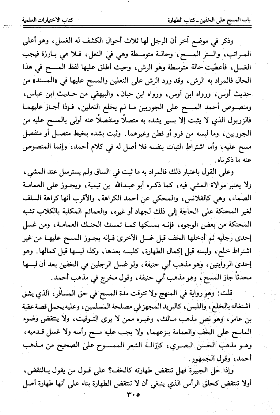 وَعَلَى الْقَوْلِ بِاعْتِبَارِ ذَلِكَ فَالْمُرَادُ بِهِ مَا ثَبَتَ فِي السَّاقِ وَلَمْ يَسْتَرْسِلْ عِنْدَ الْمَشْيِ، وَلَا يَعْتَبِرُ مُوَالَاةَ الْمَشْيِ فِيهِ، كَمَا ذَكَرَهُ أَبُو عَبْدِ اللَّهِ بْنُ تَيْمِيَّةَ، وَيَجُوزُ عَلَى الْعِمَامَةِ الصَّمَّاءِ، وَهِيَ كَالْقَلَانِسِ، وَالْمَحْكِيُّ عَنْ أَحْمَدَ الْكَرَاهَةُ، وَالْأَقْرَبُ أَنَّهَا كَرَاهَةُ السَّلَفِ لِغَيْرِ الْمُحَنَّكَةِ عَلَى الْحَاجَةِ إلَى ذَلِكَ لِجِهَادٍ أَوْ غَيْرِهِ، وَالْعَمَائِمُ الْمُكَلَّبَةُ بِالْكِلَابِ تُشْبِهُ الْمُحَنَّكَةَ مِنْ بَعْضِ الْوُجُوهِ، فَإِنَّهُ يُمْسِكُهَا كَمَا تَمْسِكُ الْحَنَكُ الْعِمَامَةَ.