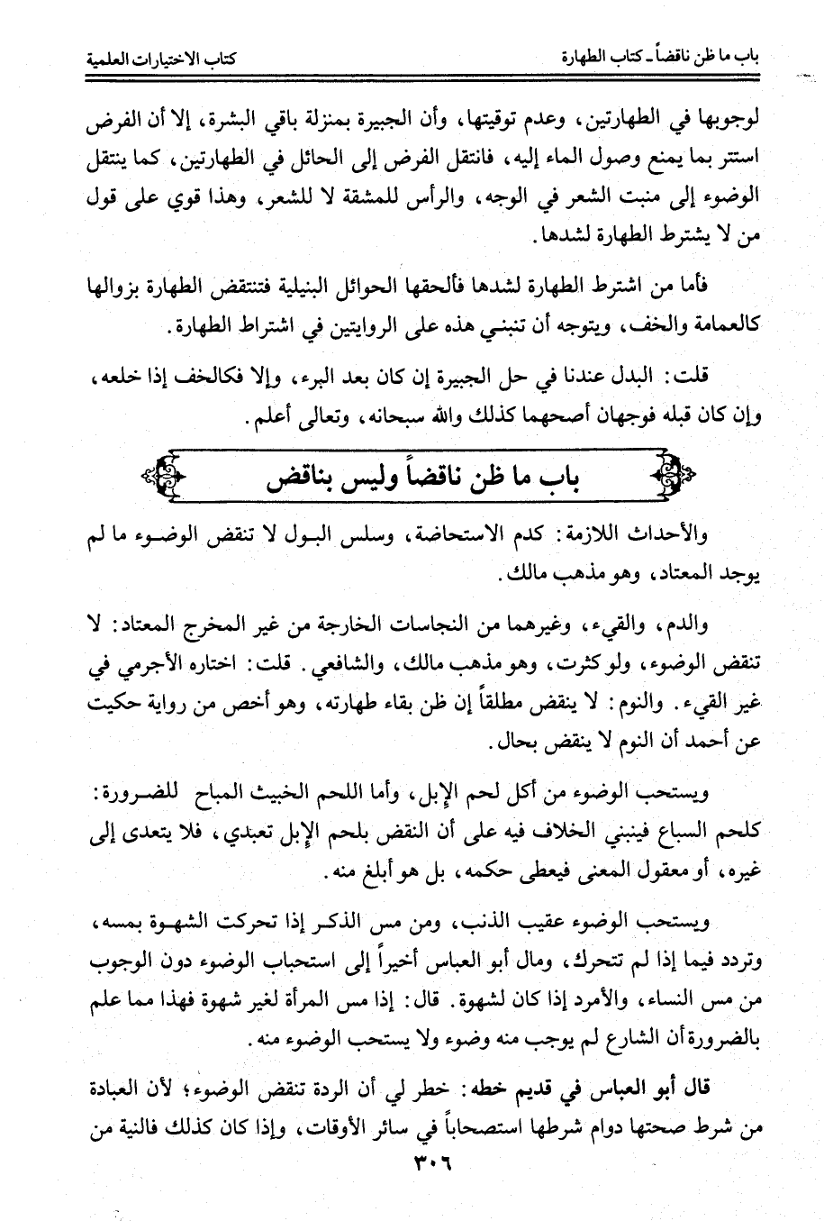 ٍ وَالْأَحْدَاثُ اللَّازِمَةُ: كَدَمِ الِاسْتِحَاضَةِ، وَسَلَسِ الْبَوْلِ لَا تَنْقُضُ الْوُضُوءَ مَا لَمْ يُوجَدْ الْمُعْتَادُ، وَهُوَ مَذْهَبُ مَالِكٍ.