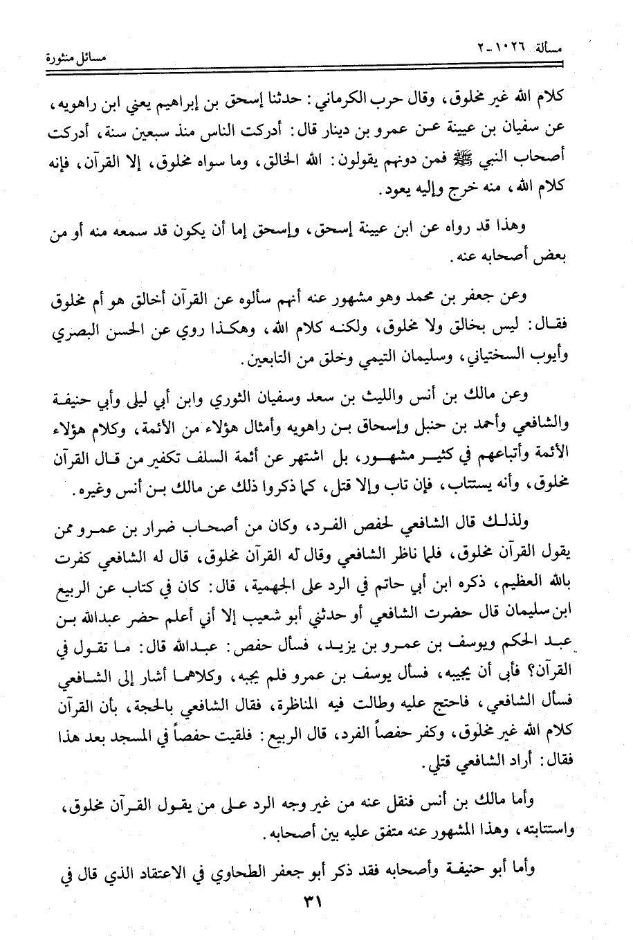 وَعَنْ مَالِكِ بْنِ أَنَسٍ وَاللَّيْثِ بْنِ سَعْدٍ وَسُفْيَانَ الثَّوْرِيِّ وَابْنِ أَبِي لَيْلَى وَأَبِي حَنِيفَةَ وَالشَّافِعِيِّ وَأَحْمَدَ بْنِ حَنْبَلٍ وَإِسْحَاقَ بْنِ رَاهْوَيْهِ وَأَمْثَالِ هَؤُلَاءِ مِنْ الْأَئِمَّةِ، وَكَلَامُ هَؤُلَاءِ الْأَئِمَّةِ وَأَتْبَاعِهِمْ فِي كَثِيرٍ مَشْهُورٌ، بَلْ اشْتَهَرَ عَنْ أَئِمَّةِ السَّلَفِ تَكْفِيرُ مَنْ قَالَ الْقُرْآنُ مَخْلُوقٌ، وَأَنَّهُ يُسْتَتَابُ، فَإِنْ تَابَ وَإِلَّا قُتِلَ، كَمَا ذَكَرُوا ذَلِكَ عَنْ مَالِكِ بْنِ أَنَسٍ وَغَيْرِهِ.