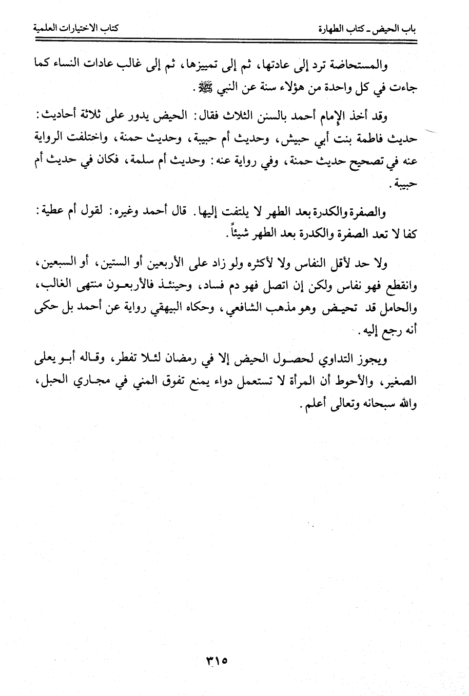 وَقَدْ أَخَذَ الْإِمَامُ أَحْمَدُ بِالسُّنَنِ الثَّلَاثِ فَقَالَ: الْحَيْضُ يَدُورُ عَلَى ثَلَاثَةِ أَحَادِيثَ: حَدِيثِ فَاطِمَةَ بِنْتِ أَبِي حُبَيْشٍ، وَحَدِيثِ أُمِّ حَبِيبَةَ، وَحَدِيثِ حَمْنَةَ، وَاخْتَلَفَتْ الرِّوَايَةُ عَنْهُ فِي تَصْحِيحِ حَدِيثِ حَمْنَةَ، وَفِي رِوَايَةٍ عَنْهُ: وَحَدِيثِ أُمِّ سَلَمَةَ، فَكَانَ فِي حَدِيثِ أُمِّ حَبِيبَةَ.