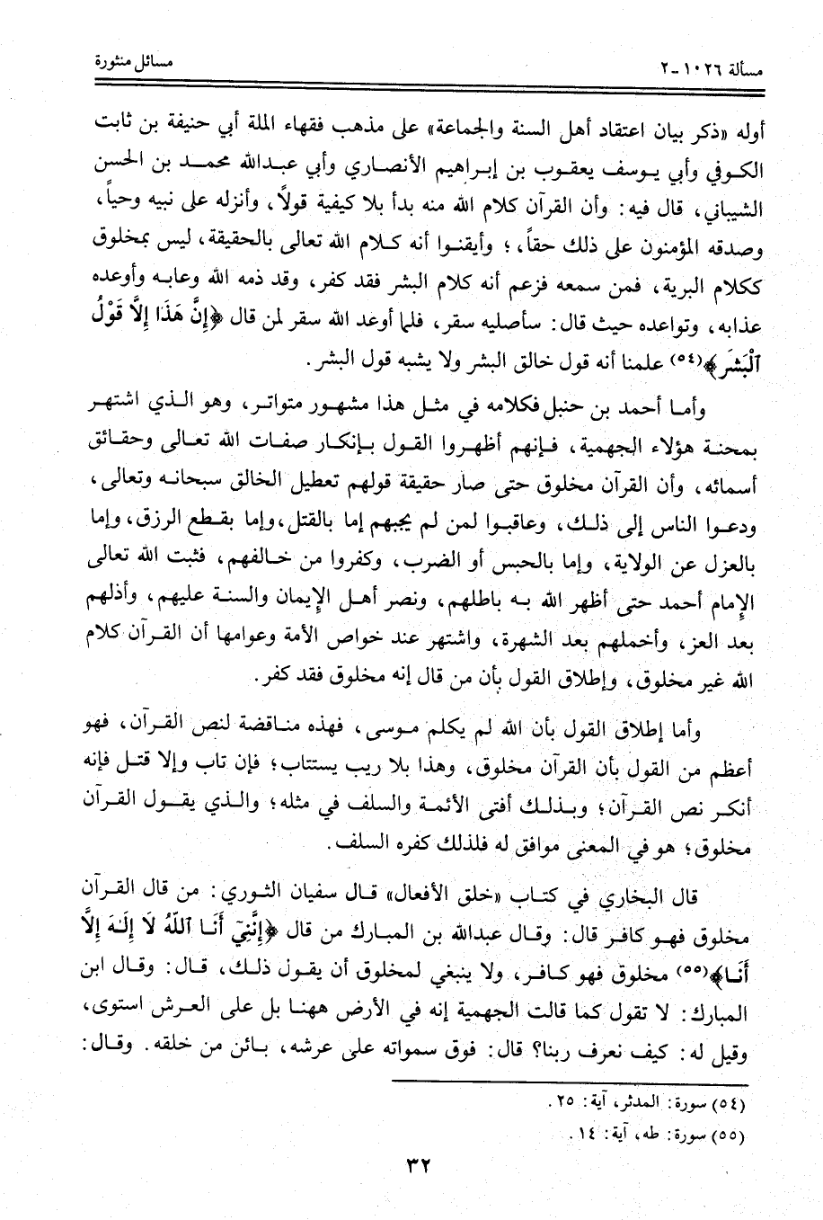 أَوَّلِهِ " ذِكْرُ بَيَانِ اعْتِقَادِ أَهْلِ السُّنَّةِ وَالْجَمَاعَةِ " عَلَى مَذْهَبِ فُقَهَاءِ الْمِلَّةِ أَبِي حَنِيفَةَ بْنِ ثَابِتٍ الْكُوفِيِّ وَأَبِي يُوسُفَ يَعْقُوبَ بْنِ إبْرَاهِيمَ الْأَنْصَارِيِّ وَأَبِي عَبْدِ اللَّهِ مُحَمَّدِ بْنِ الْحَسَنِ الشَّيْبَانِيِّ، قَالَ فِيهِ: وَإِنَّ الْقُرْآنَ كَلَامُ اللَّهِ مِنْهُ بَدَأَ بِلَا كَيْفِيَّةٍ قَوْلًا، وَأَنْزَلَهُ عَلَى نَبِيِّهِ وَحْيًا، وَصَدَّقَهُ الْمُؤْمِنُونَ عَلَى ذَلِكَ حَقًّا، وَأَيْقَنُوا أَنَّهُ كَلَامُ اللَّهِ تَعَالَى بِالْحَقِيقَةِ، لَيْسَ بِمَخْلُوقٍ كَكَلَامِ الْبَرِّيَّةِ، فَمَنْ سَمِعَهُ فَزَعَمَ أَنَّهُ كَلَامُ الْبَشَرِ فَقَدْ كَفَرَ، وَقَدْ ذَمَّهُ اللَّهُ وَعَابَهُ وَأَوْعَدَهُ عَذَابَهُ، وَتَوَاعَدَهُ حَيْثُ قَالَ: سَأُصْلِيهِ سَقَرَ، فَلَمَّا أَوْعَدَ اللَّهُ سَقَرَ لِمَنْ قَالَ {إِنْ هَذَا إِلا قَوْلُ الْبَشَرِ} [المدثر: 25] عَلِمْنَا أَنَّهُ قَوْلُ خَالِقِ الْبَشَرِ وَلَا يُشْبِهُ قَوْلَ الْبَشَرِ.