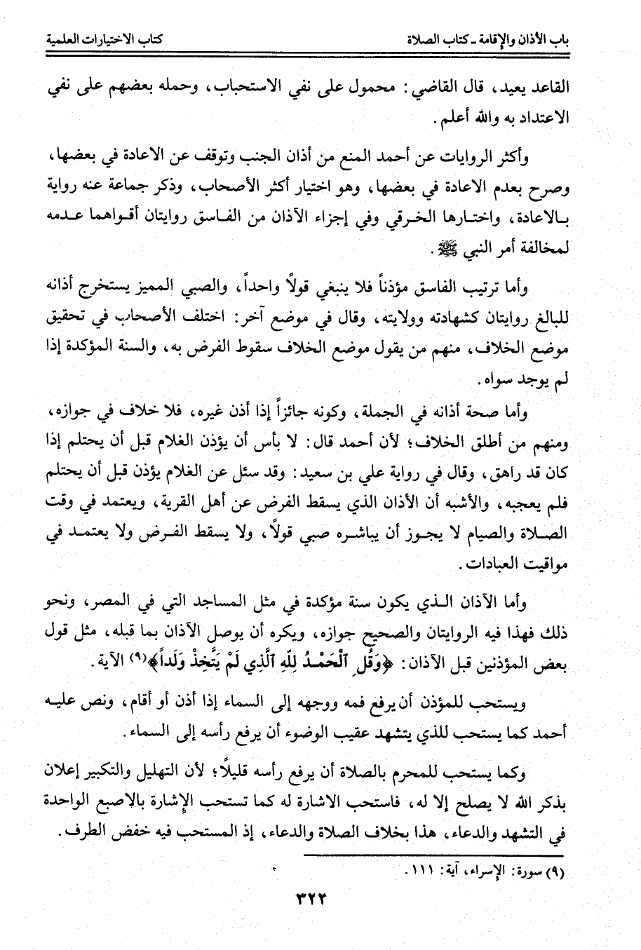 وَأَمَّا الْأَذَانُ الَّذِي يَكُونُ سُنَّةً مُؤَكَّدَةً فِي مِثْلِ الْمَسَاجِدِ الَّتِي فِي الْمِصْرِ، وَنَحْوُ ذَلِكَ فَهَذَا فِيهِ الرِّوَايَتَانِ وَالصَّحِيحُ جَوَازُهُ، وَيُكْرَهُ أَنْ يُوصَلَ الْأَذَانُ بِمَا قَبْلَهُ، مِثْلَ قَوْلِ بَعْضِ الْمُؤَذِّنِينَ قَبْلَ الْأَذَانِ: {وَقُلِ الْحَمْدُ لِلَّهِ الَّذِي لَمْ يَتَّخِذْ وَلَدًا} [الإسراء: 111] الْآيَةَ. وَيُسْتَحَبُّ لِلْمُؤَذِّنِ أَنْ يَرْفَعَ فَمَه وَوَجْهَهُ إلَى السَّمَاءِ إذَا أَذَّنَ أَوْ أَقَامَ، وَنَصَّ عَلَيْهِ أَحْمَدُ كَمَا يُسْتَحَبُّ لِلَّذِي يَتَشَهَّدُ عَقِيبَ الْوُضُوءِ أَنْ يَرْفَعَ رَأْسَهُ إلَى السَّمَاءِ.