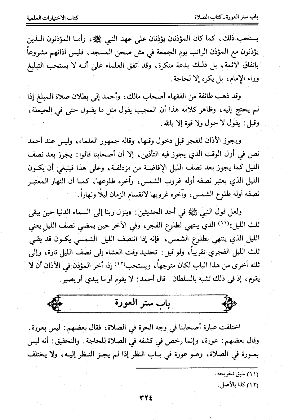 وَلَعَلَّ قَوْلَ النَّبِيِّ - صَلَّى اللَّهُ عَلَيْهِ وَسَلَّمَ - فِي أَحَدِ الْحَدِيثَيْنِ: «يَنْزِلُ رَبُّنَا إلَى السَّمَاءِ الدُّنْيَا حِينَ يَبْقَى ثُلُثُ اللَّيْلِ» الَّذِي يَنْتَهِي لِطُلُوعِ الْفَجْرِ، وَفِي الْآخَرِ حِينَ يَمْضِي نِصْفُ اللَّيْلِ يَعْنِي اللَّيْلَ الَّذِي يَنْتَهِي بِطُلُوعِ الشَّمْسِ، فَإِنَّهُ إذَا انْتَصَفَ اللَّيْلُ الشَّمْسِيُّ يَكُونُ قَدْ بَقِيَ ثُلُثُ اللَّيْلِ الْفَجْرِيُّ تَقْرِيبًا، وَلَوْ قِيلَ: تَحْدِيدُ وَقْتِ الْعِشَاءِ إلَى نِصْفِ اللَّيْلِ تَارَةً، وَإِلَى ثُلُثِهِ أُخْرَى مِنْ هَذَا الْبَابِ لَكَانَ مُتَوَجَّهًا، وَيُسْتَحَبُّ؛ إذَا أَخَّرَ الْمُؤَذِّنُ فِي الْأَذَانِ أَنْ لَا يَقُومَ، إذْ فِي ذَلِكَ تَشَبُّهٌ بِالسُّلْطَانِ. قَالَ أَحْمَدُ: لَا يَقُومُ أَوْ مَا يُبْدِي أَوْ يَصِيرُ.