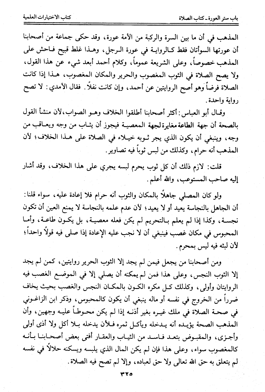 الْمَذْهَبُ فِي أَنَّ مَا بَيْنَ السُّرَّةِ وَالرُّكْبَةِ مِنْ الْأَمَةِ عَوْرَةٌ، وَقَدْ حَكَى جَمَاعَةٌ مِنْ أَصْحَابِنَا أَنَّ عَوْرَتَهَا السَّوْأَتَانِ فَقَطْ كَالرِّوَايَةِ فِي عَوْرَةِ الرَّجُلِ، وَهَذَا غَلَطٌ قَبِيحٌ فَاحِشٌ عَلَى الْمَذْهَبِ خُصُوصًا، وَعَلَى الشَّرِيعَةِ عُمُومًا، وَكَلَامُ أَحْمَدَ أَبْعَدُ شَيْءٍ عَنْ هَذَا الْقَوْلِ، وَلَا يَصِحُّ الصَّلَاةُ فِي الثَّوْبِ الْمَغْصُوبِ وَالْحَرِيرِ وَالْمَكَانِ الْمَغْصُوبِ، هَذَا إذَا كَانَتْ الصَّلَاةُ فَرْضًا وَهُوَ أَصَحُّ الرِّوَايَتَيْنِ عَنْ أَحْمَدَ، وَإِنْ كَانَتْ نَفْلًا. فَقَالَ الْآمِدِيُّ: لَا تَصِحُّ رِوَايَةً وَاحِدَةً.