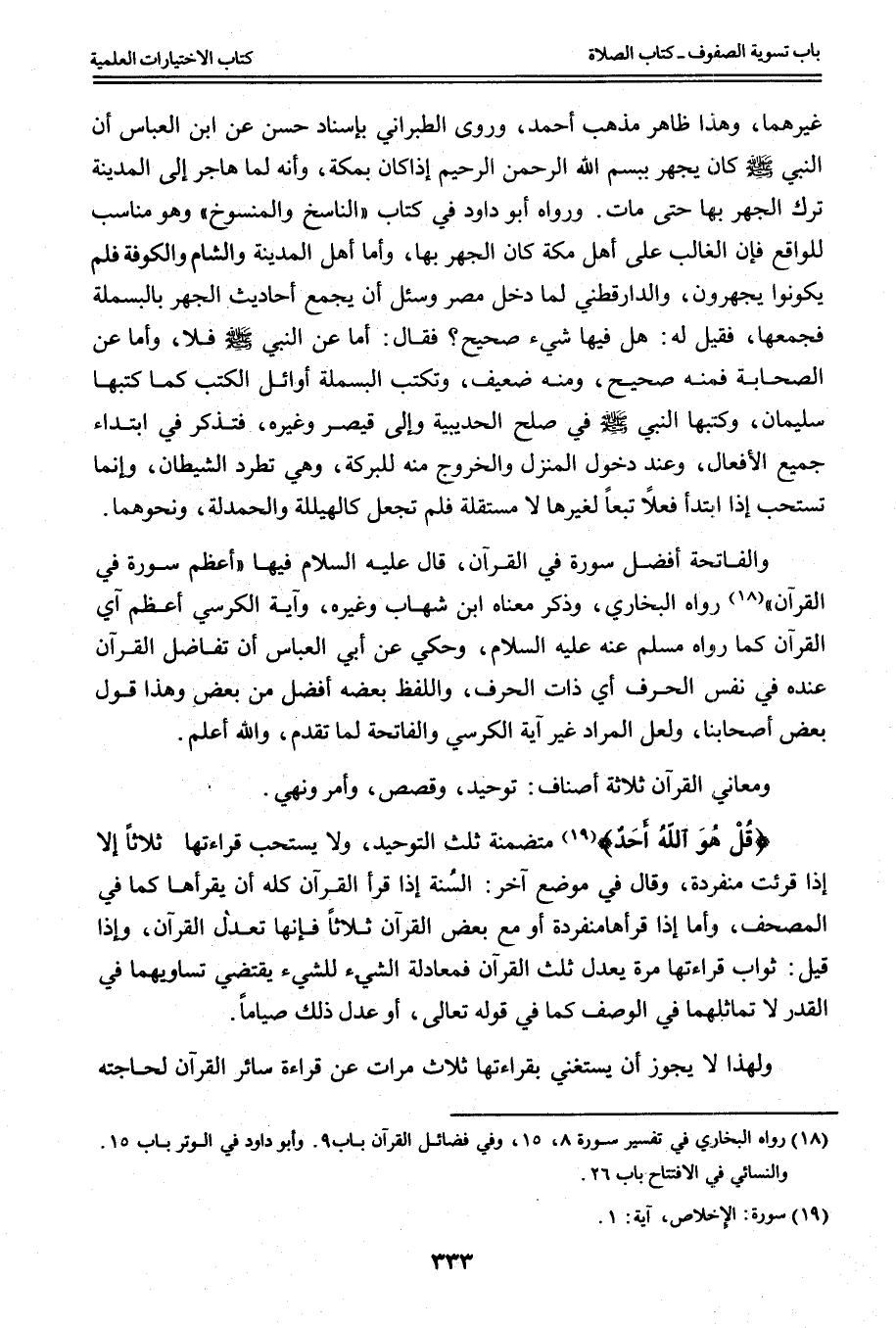 وَمَعَانٍ الْقُرْآنِ ثَلَاثَةُ أَصْنَافٍ: تَوْحِيدٌ، وَقَصَصٌ، وَأَمْرٌ وَنَهْيٌ. {قُلْ هُوَ اللَّهُ أَحَدٌ} مُتَضَمَّنَةٌ ثُلُثَ التَّوْحِيدِ، وَلَا يُسْتَحَبُّ قِرَاءَتُهَا ثَلَاثًا إلَّا إذَا قُرِئَتْ مُنْفَرِدَةً [ {قُلْ هُوَ اللَّهُ أَحَدٌ} [الإخلاص: 1]] وَقَالَ فِي مَوْضِعٍ آخَرَ: السُّنَّةُ إذَا قَرَأَ الْقُرْآنَ كُلَّهُ أَنْ يَقْرَأَهَا كَمَا فِي الْمُصْحَفِ، وَأَمَّا إذَا قَرَأَهَا مُنْفَرِدَةً أَوْ مَعَ بَعْضِ الْقُرْآنِ ثَلَاثًا فَإِنَّهَا تَعْدِلُ الْقُرْآنَ، وَإِذَا قِيلَ: ثَوَابُ قِرَاءَتِهَا مَرَّةً يَعْدِلُ ثُلُثَ الْقُرْآنِ فَمُعَادَلَةُ الشَّيْءِ لِلشَّيْءِ يَقْتَضِي تَسَاوِيهِمَا فِي الْقَدْرِ لَا تَمَاثُلَهُمَا فِي الْوَصْفِ كَمَا فِي قَوْله تَعَالَى {أَوْ عَدْلُ ذَلِكَ صِيَامًا} [المائدة: 95] .