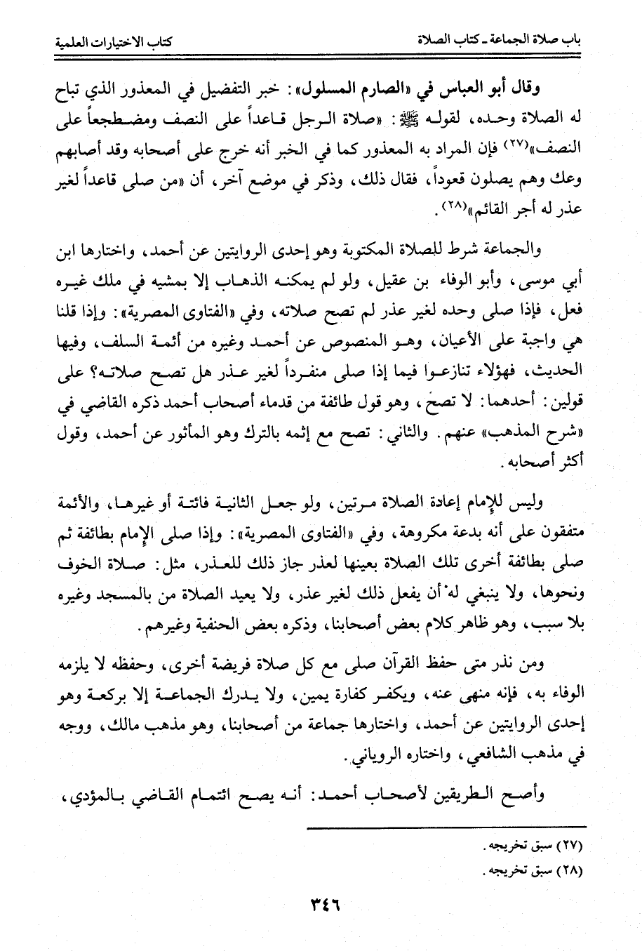 وَقَالَ أَبُو الْعَبَّاسِ فِي " الصَّارِمِ الْمَسْلُولِ ": خَبَرُ التَّفْضِيلِ فِي الْمَعْذُورِ الَّذِي تُبَاحُ لَهُ الصَّلَاةُ وَحْدَهُ، لِقَوْلِهِ - صَلَّى اللَّهُ عَلَيْهِ وَسَلَّمَ -: «صَلَاةُ الرَّجُلِ قَاعِدًا عَلَى النِّصْفِ وَمُضْطَجِعًا عَلَى النِّصْفِ» فَإِنَّ الْمُرَادَ بِهِ الْمَعْذُورُ كَمَا فِي الْخَبَرِ أَنَّهُ خَرَجَ عَلَى أَصْحَابِهِ وَقَدْ أَصَابَهُمْ وَعْكٌ وَهُمْ يُصَلُّونَ قُعُودًا، فَقَالَ ذَلِكَ، وَذَكَرَ فِي مَوْضِعٍ آخَرَ، أَنَّ «مَنْ صَلَّى قَاعِدًا لِغَيْرِ عُذْرٍ لَهُ أَجْرُ الْقَائِمِ» .