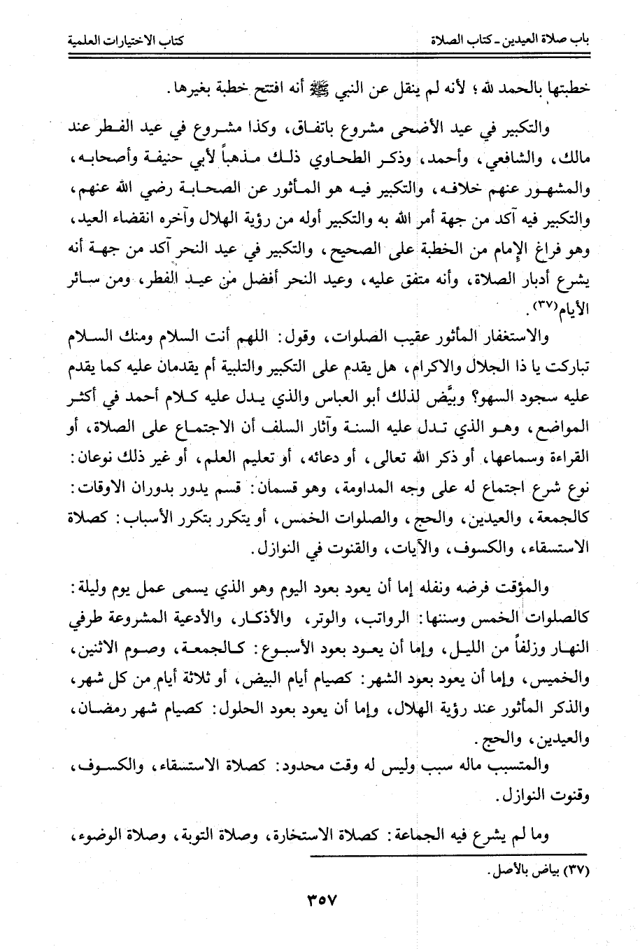 وَذَكَرَ الطَّحَاوِيُّ ذَلِكَ مَذْهَبًا لِأَبِي حَنِيفَةَ وَأَصْحَابِهِ، وَالْمَشْهُورُ عَنْهُمْ خِلَافُهُ، وَالتَّكْبِيرُ فِيهِ هُوَ الْمَأْثُورُ عَنْ الصَّحَابَةِ - رَضِيَ اللَّهُ عَنْهُمْ -، وَالتَّكْبِيرُ فِيهِ آكَدُ مِنْ جِهَةِ أَمْرِ اللَّهِ بِهِ وَالتَّكْبِيرُ أَوَّلَهُ مِنْ رُؤْيَةِ الْهِلَالِ وَآخِرَهُ انْقِضَاءُ الْعِيدِ، وَهُوَ فَرَاغُ الْإِمَامِ مِنْ الْخُطْبَةِ عَلَى الصَّحِيحِ، وَالتَّكْبِيرُ فِي عِيدِ النَّحْرِ آكَدُ مِنْ جِهَةِ أَنَّهُ يُشْرَعُ أَدْبَارَ الصَّلَاةِ، وَأَنَّهُ مُتَّفَقٌ عَلَيْهِ، وَعِيدُ النَّحْرِ أَفْضَلُ مِنْ عِيدِ الْفِطْرِ، وَمِنْ سَائِرِ الْأَيَّامِ.