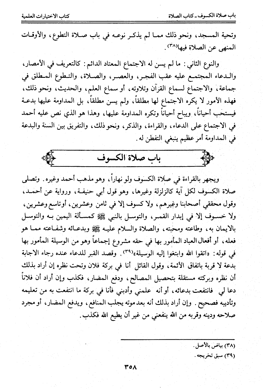 وَتُصَلَّى صَلَاةُ الْكُسُوفِ لِكُلِّ آيَةٍ كَالزَّلْزَلَةِ وَغَيْرِهَا، وَهُوَ قَوْلُ أَبِي حَنِيفَةَ، وَرِوَايَةٌ عَنْ أَحْمَدَ، وَقَوْلُ مُحَقِّقِي أَصْحَابِنَا وَغَيْرِهِمْ، وَلَا كُسُوفَ إلَّا فِي ثَامِنٍ وَعِشْرِينَ، أَوْ تَاسِعٍ وَعِشْرِينَ، وَلَا خُسُوفَ إلَّا فِي إبْدَارِ الْقَمَرِ، وَالتَّوَسُّلِ بِالنَّبِيِّ - صَلَّى اللَّهُ عَلَيْهِ وَسَلَّمَ - كَمَسْأَلَةِ الْيَمِينِ بِهِ وَالتَّوَسُّلِ بِالْإِيمَانِ بِهِ، وَطَاعَتِهِ وَمَحَبَّتِهِ، وَالصَّلَاةِ وَالسَّلَامِ عَلَيْهِ - صَلَّى اللَّهُ عَلَيْهِ وَسَلَّمَ - وَبِدُعَائِهِ وَشَفَاعَتِهِ مِمَّا هُوَ فِعْلُهُ، أَوْ أَفْعَالُ الْعِبَادِ الْمَأْمُورُ بِهَا فِي حَقِّهِ مَشْرُوعٌ إجْمَاعًا وَهُوَ مِنْ الْوَسِيلَةِ الْمَأْمُورِ بِهَا فِي قَوْلِهِ: {اتَّقُوا اللَّهَ وَابْتَغُوا إِلَيْهِ الْوَسِيلَةَ} [المائدة: 35] .