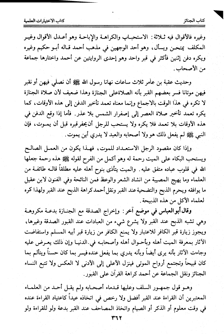 وَهُوَ قَوْلُ جُمْهُورِ السَّلَفِ وَعَلَيْهَا قُدَمَاءُ أَصْحَابِهِ وَلَمْ يَقُلْ أَحَدٌ مِنْ الْعُلَمَاءِ الْمُعْتَبَرِينَ: إنَّ الْقِرَاءَةَ عِنْدَ الْقَبْرِ أَفْضَلُ وَلَا رَخَّصَ فِي اتِّخَاذِهِ عِيدًا كَاعْتِيَادِ الْقِرَاءَةِ عِنْدَهُ فِي وَقْتٍ مَعْلُومٍ أَوْ الذِّكْرِ أَوْ الصِّيَامِ، وَاِتِّخَاذُ الْمَصَاحِفِ عِنْدَ الْقَبْرِ بِدْعَةٌ وَلَوْ لِلْقِرَاءَةِ وَلَوْ