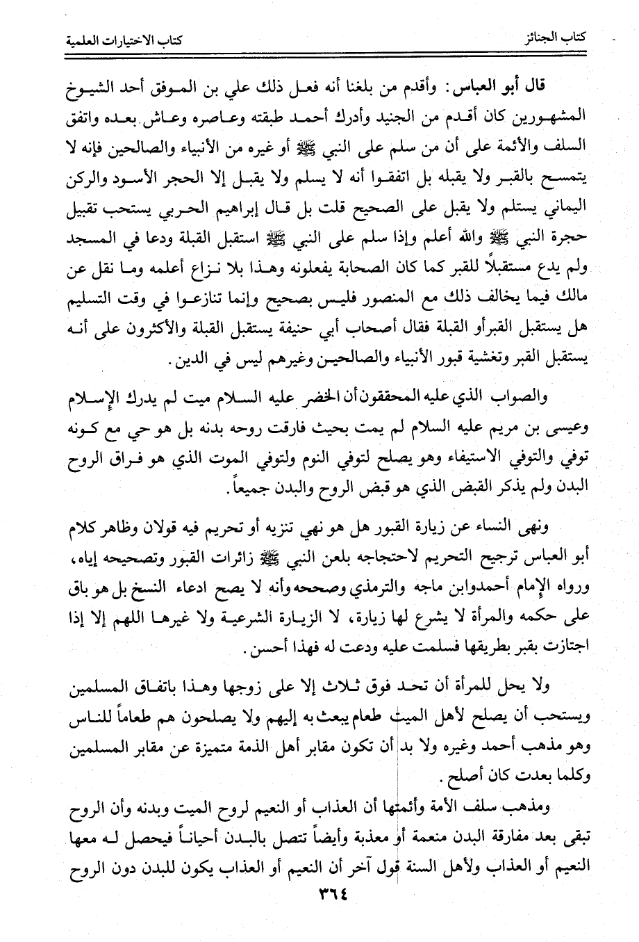 وَنَهْيُ النِّسَاءِ عَنْ زِيَارَةِ الْقُبُورِ هَلْ هُوَ نَهْيُ تَنْزِيهٍ أَوْ تَحْرِيمٍ؟ فِيهِ قَوْلَانِ وَظَاهِرُ كَلَامِ أَبِي الْعَبَّاسِ تَرْجِيحُ التَّحْرِيمِ لِاحْتِجَاجِهِ بِلَعْنِ النَّبِيِّ - صَلَّى اللَّهُ عَلَيْهِ وَسَلَّمَ - زَائِرَاتِ الْقُبُورِ وَتَصْحِيحِهِ إيَّاهُ، وَرَوَاهُ الْإِمَامُ أَحْمَدُ وَابْنُ مَاجَهْ وَالتِّرْمِذِيُّ وَصَحَّحَهُ وَأَنَّهُ لَا يَصِحُّ ادِّعَاءُ النَّسْخِ بَلْ هُوَ بَاقٍ عَلَى حُكْمِهِ وَالْمَرْأَةُ لَا يُشْرَعُ لَهَا زِيَارَةٌ، لَا الزِّيَارَةُ الشَّرْعِيَّةُ وَلَا غَيْرُهَا اللَّهُمَّ إلَّا إذَا اجْتَازَتْ بِقَبْرٍ بِطَرِيقِهَا فَسَلَّمَتْ عَلَيْهِ وَدَعَتْ لَهُ فَهَذَا أَحْسَنُ.