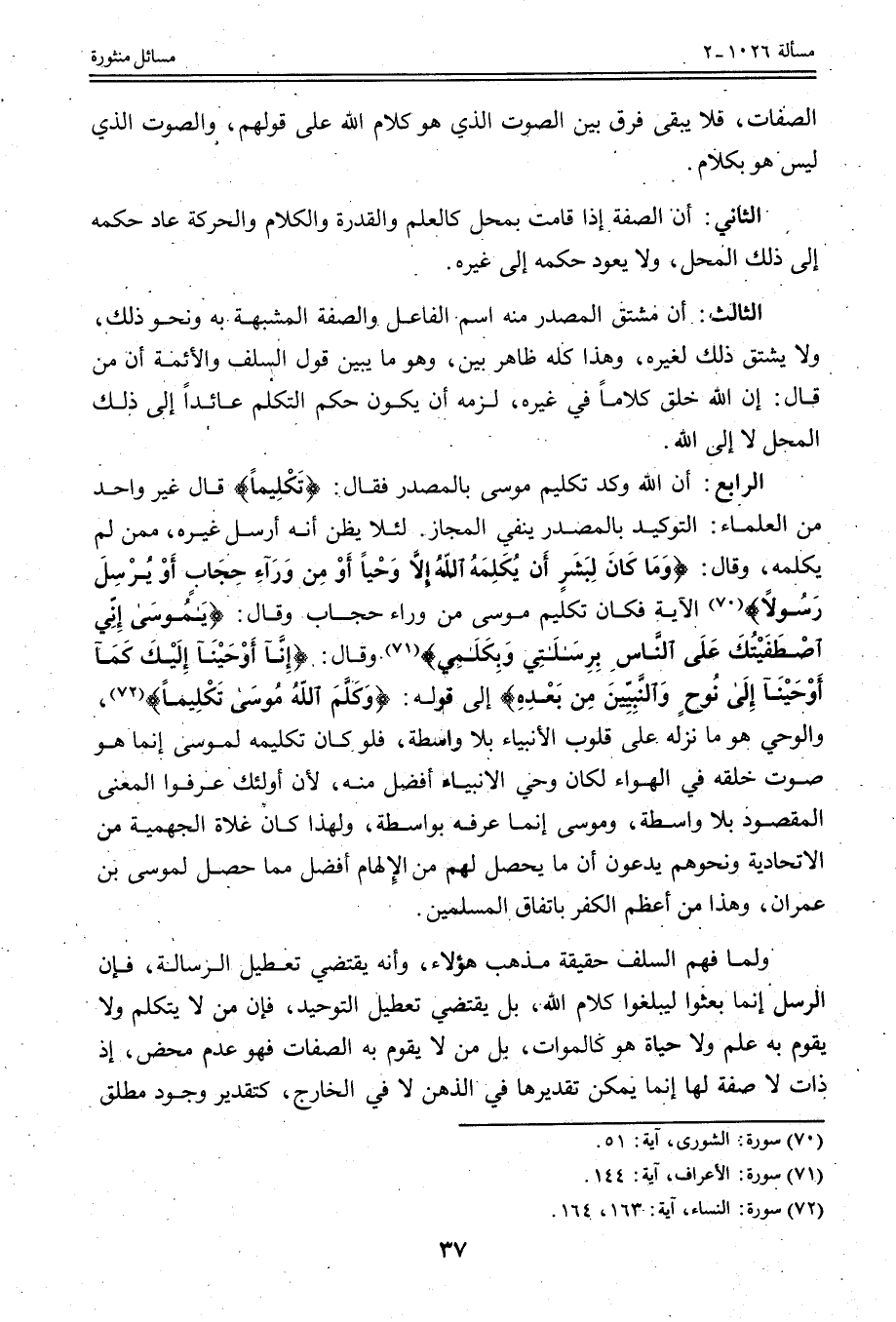 الثَّالِثُ: أَنَّ مُشْتَقَّ الْمَصْدَرِ مِنْهُ اسْمُ الْفَاعِلِ وَالصِّفَةُ الْمُشَبَّهَةُ بِهِ وَنَحْوُ ذَلِكَ، وَلَا يُشْتَقُّ ذَلِكَ لِغَيْرِهِ، وَهَذَا كُلُّهُ ظَاهِرٌ بَيِّنٌ، وَهُوَ مَا يُبَيِّنُ قَوْلَ السَّلَفِ وَالْأَئِمَّةِ إنَّ مَنْ قَالَ: إنَّ اللَّهَ خَلَقَ كَلَامًا فِي غَيْرِهِ، لَزِمَهُ أَنْ يَكُونَ حُكْمُ التَّكَلُّمِ عَائِدًا إلَى ذَلِكَ الْمَحَلِّ لَا إلَى اللَّهِ.