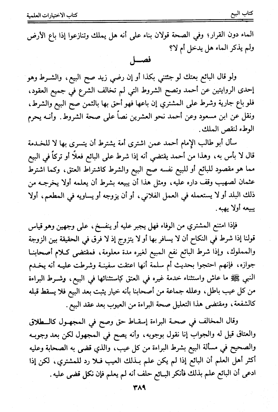 وَقَالَ الْمُخَالِفُ فِي صِحَّةِ الْبَرَاءَةِ إسْقَاطُ حَقٍّ وَصَحَّ فِي الْمَجْهُولِ كَالطَّلَاقِ وَالْعَتَاقِ قِيلَ لَهُ وَالْجَوَابُ أَنَّا نَقُولُ بِوُجُوبِهِ، وَأَنَّهُ يَصِحُّ فِي الْمَجْهُولِ لَكِنْ بَعْدَ وُجُوبِهِ وَالصَّحِيحُ فِي مَسْأَلَةِ الْبَيْعِ بِشَرْطِ الْبَرَاءَةِ مِنْ كُلِّ عَيْبٍ، وَاَلَّذِي قَضَى بِهِ الصَّحَابَةُ وَعَلَيْهِ أَكْثَرُ أَهْلِ الْعِلْمِ أَنَّ الْبَائِعَ إذَا لَمْ يَكُنْ عَلِمَ بِذَلِكَ الْعَيْبِ فَلَا رَدَّ لِلْمُشْتَرِي، لَكِنْ إذَا ادَّعَى أَنَّ الْبَائِعَ عَلِمَ بِذَلِكَ فَأَنْكَرَ الْبَائِعُ حَلَفَ أَنَّهُ لَمْ يَعْلَمْ فَإِنْ نَكَلَ قُضِيَ عَلَيْهِ.
