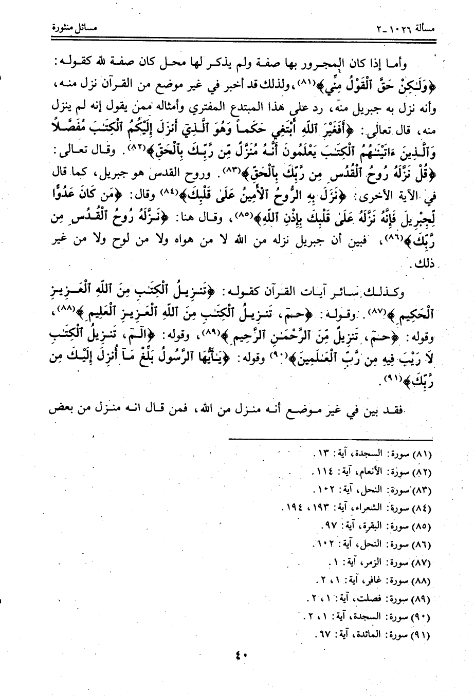 وَأَمَّا إذَا كَانَ الْمَجْرُورُ بِهَا صِفَةً وَلَمْ يُذْكَرْ لَهَا مَحَلٌّ كَانَ صِفَةً لِلَّهِ كَقَوْلِهِ: {وَلَكِنْ حَقَّ الْقَوْلُ مِنِّي} [السجدة: 13] ، وَلِذَلِكَ قَدْ أَخْبَرَ فِي غَيْرِ مَوْضِعٍ مِنْ الْقُرْآنِ نَزَلَ مِنْهُ، وَأَنَّهُ نَزَلَ بِهِ جِبْرِيلُ مِنْهُ، رَدَّ عَلَى هَذَا الْمُبْتَدِعِ الْمُفْتَرِي وَأَمْثَالِهِ مِمَّنْ يَقُولُ إنَّهُ لَمْ يَنْزِلْ مِنْهُ، قَالَ تَعَالَى: {أَفَغَيْرَ اللَّهِ أَبْتَغِي حَكَمًا وَهُوَ الَّذِي أَنْزَلَ إِلَيْكُمُ الْكِتَابَ مُفَصَّلا وَالَّذِينَ آتَيْنَاهُمُ الْكِتَابَ يَعْلَمُونَ أَنَّهُ مُنَزَّلٌ مِنْ رَبِّكَ بِالْحَقِّ} [الأنعام: 114] .