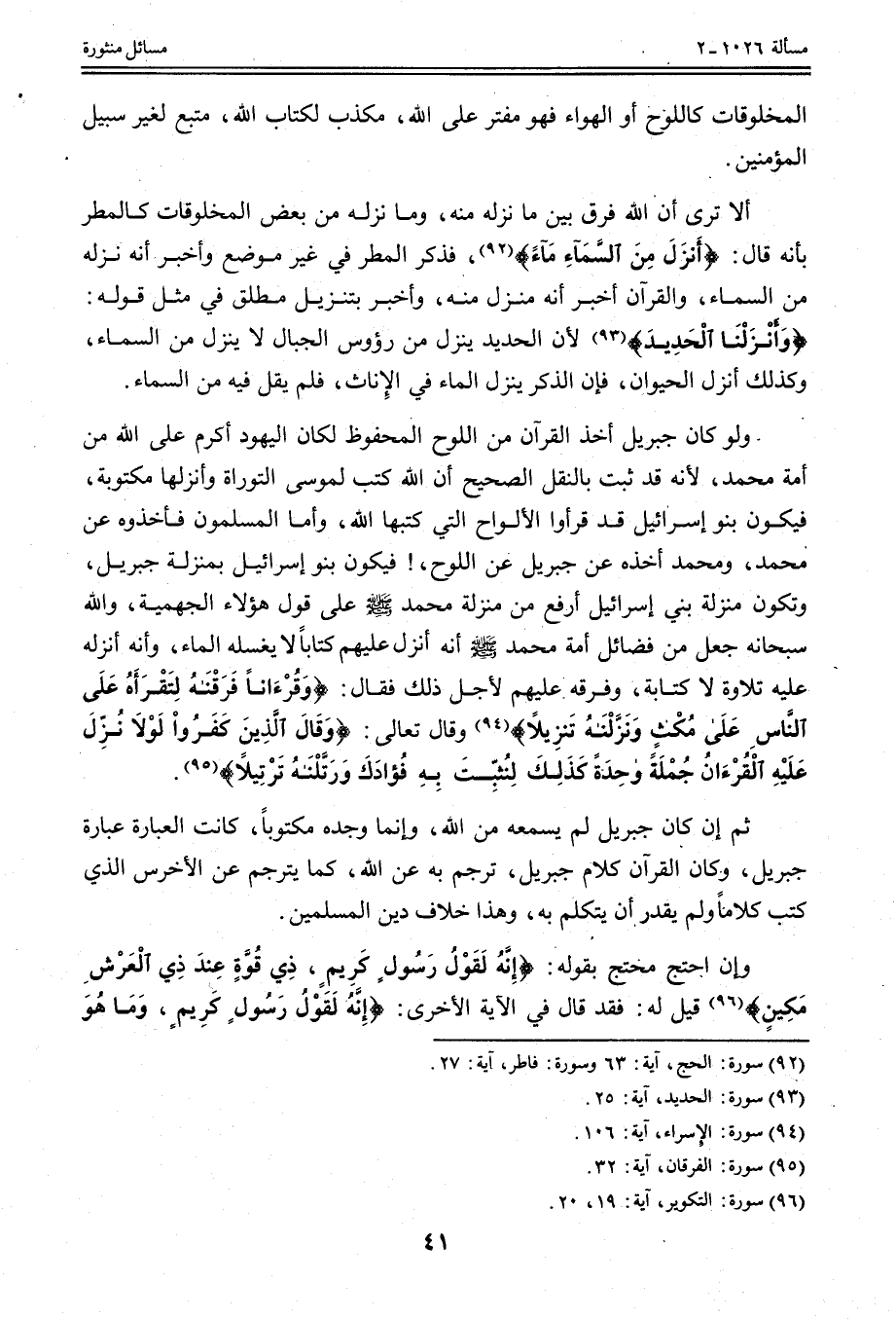 الْمَخْلُوقَاتِ كَاللَّوْحِ أَوْ الْهَوَاءِ فَهُوَ مُفْتَرٍ عَلَى اللَّهِ، مُكَذِّبٌ لِكِتَابِ اللَّهِ، مُتَّبِعٌ لِغَيْرِ سَبِيلِ الْمُؤْمِنِينَ.