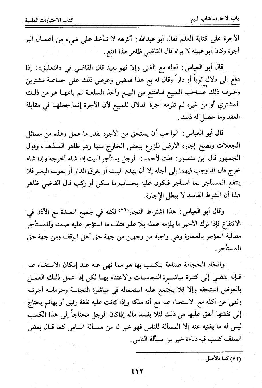 الْأُجْرَةَ عَلَى كِتَابَةِ الْعِلْمِ فَقَالَ أَبُو عَبْدِ اللَّهِ: أَكْرَهُهُ لَا نَأْخُذُ عَلَى شَيْءٍ مِنْ أَعْمَالِ الْبِرِّ أُجْرَةً وَكَانَ أَبُو عُيَيْنَةَ لَا يَرَاهُ قَالَ الْقَاضِي ظَاهِرُ هَذَا الْمَنْعُ. قَالَ أَبُو الْعَبَّاسِ: لَعَلَّهُ مَعَ الْغِنَى وَإِلَّا فَهُوَ بَعِيدٌ قَالَ الْقَاضِي فِي التَّعْلِيقِ ": إذَا دَفَعَ إلَى دَلَّالٍ ثَوْبًا أَوْ دَارًا وَقَالَ لَهُ: بِعْ هَذَا فَمَضَى وَعَرَضَ ذَلِكَ عَلَى جَمَاعَةٍ مُشْتَرِينَ وَعَرَفَ ذَلِكَ صَاحِبُ الْمَبِيعِ فَامْتَنَعَ مِنْ الْبَيْعِ وَأَخَذَ السِّلْعَةَ ثُمَّ بَاعَهَا هُوَ مِنْ ذَلِكَ الْمُشْتَرِي أَوْ مِنْ غَيْرِهِ لَمْ تَلْزَمْهُ أُجْرَةُ الدَّلَّالِ لِلْمَبِيعِ لِأَنَّ الْأُجْرَةَ إنَّمَا جَعَلَهَا فِي مُقَابَلَةِ الْعَقْدِ وَمَا حَصَلَ لَهُ ذَلِكَ. قَالَ أَبُو الْعَبَّاسِ: الْوَاجِبُ أَنْ يَسْتَحِقَّ مِنْ الْأُجْرَةِ بِقَدْرِ مَا عَمِلَ وَهَذِهِ مِنْ مَسَائِلِ الْجَعَلَاتِ وَتَصِحُّ إجَارَةُ الْأَرْضِ لِلزَّرْعِ بِبَعْضِ الْخَارِجِ مِنْهَا وَهُوَ ظَاهِرُ الْمَذْهَبِ وَقَوْلُ الْجُمْهُورِ قَالَ ابْنُ مَنْصُورٍ: قُلْت لِأَحْمَدَ: الرَّجُلُ يَسْتَأْجِرُ الْبَيْتَ إذَا شَاءَ أَخْرَجَهُ وَإِذَا شَاءَ خَرَجَ قَالَ قَدْ وَجَبَ فِيهِمَا إلَى أَجَلِهِ إلَّا أَنْ يُهْدَمَ الْبَيْتُ أَوْ يَغْرَقَ الدَّارُ أَوْ يَمُوتَ الْبَعِيرُ فَلَا يَنْتَفِعُ الْمُسْتَأْجِرُ بِمَا اسْتَأْجَرَ فَيَكُونُ عَلَيْهِ بِحِسَابِ مَا سَكَنَ أَوْ رَكِبَ قَالَ الْقَاضِي ظَاهِرُ هَذَا أَنَّ الشَّرْطَ الْفَاسِدَ لَا يُبْطِلُ الْإِجَارَةَ.