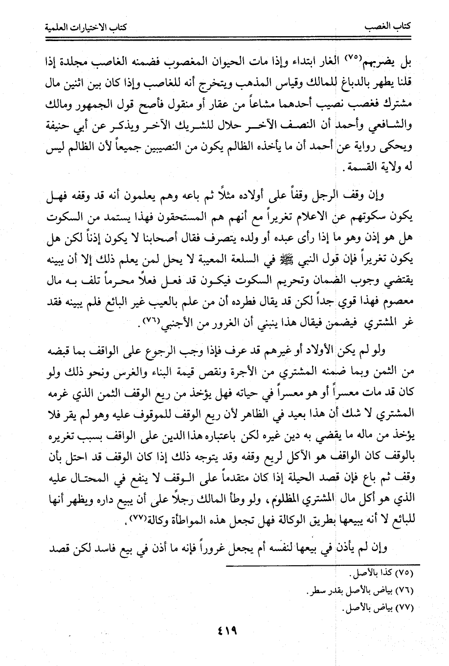 وَإِنْ وَقَفَ الرَّجُلُ وَقْفًا عَلَى أَوْلَادِهِ مَثَلًا ثُمَّ بَاعَهُ وَهُمْ يَعْلَمُونَ أَنَّهُ قَدْ وَقَفَهُ فَهَلْ يَكُونُ سُكُوتُهُمْ عَنْ الْإِعْلَامِ تَغْرِيرًا مَعَ أَنَّهُمْ هُمْ الْمُسْتَحِقُّونَ فَهَذَا يُسْتَمَدُّ مِنْ السُّكُوتِ هَلْ هُوَ إذْنٌ وَهُوَ مَا إذَا رَأَى عَبْدَهُ أَوْ وَلَدَهُ يَتَصَرَّفُ فَقَالَ أَصْحَابُنَا لَا يَكُونُ إذْنًا لَكِنْ هَلْ يَكُونُ تَغْرِيرًا فَإِنَّ قَوْلَ النَّبِيِّ - صَلَّى اللَّهُ عَلَيْهِ وَسَلَّمَ - فِي السِّلْعَةِ الْمَعِيبَةِ «لَا يَحِلُّ لِمَنْ يَعْلَمُ ذَلِكَ إلَّا أَنْ يُبَيِّنَهُ» يَقْتَضِي وُجُوبَ الضَّمَانِ وَتَحْرِيمَ السُّكُوتِ فَيَكُونُ قَدْ فَعَلَ فِعْلًا مُحَرَّمًا تَلِفَ بِهِ مَالٌ مَعْصُومٌ فَهَذَا قَوِيٌّ جِدًّا لَكِنْ قَدْ يُقَالُ فَطَرْدُهُ أَنَّ مَنْ عَلِمَ بِالْعَيْبِ غَيْرُ الْبَائِعِ فَلَمْ يُبَيِّنْهُ فَقَدْ غَرَّ الْمُشْتَرِيَ فَيَضْمَنُ فَيُقَالُ هَذَا يَنْبَنِي أَنَّ الْغُرُورَ مِنْ الْأَجْنَبِيِّ.