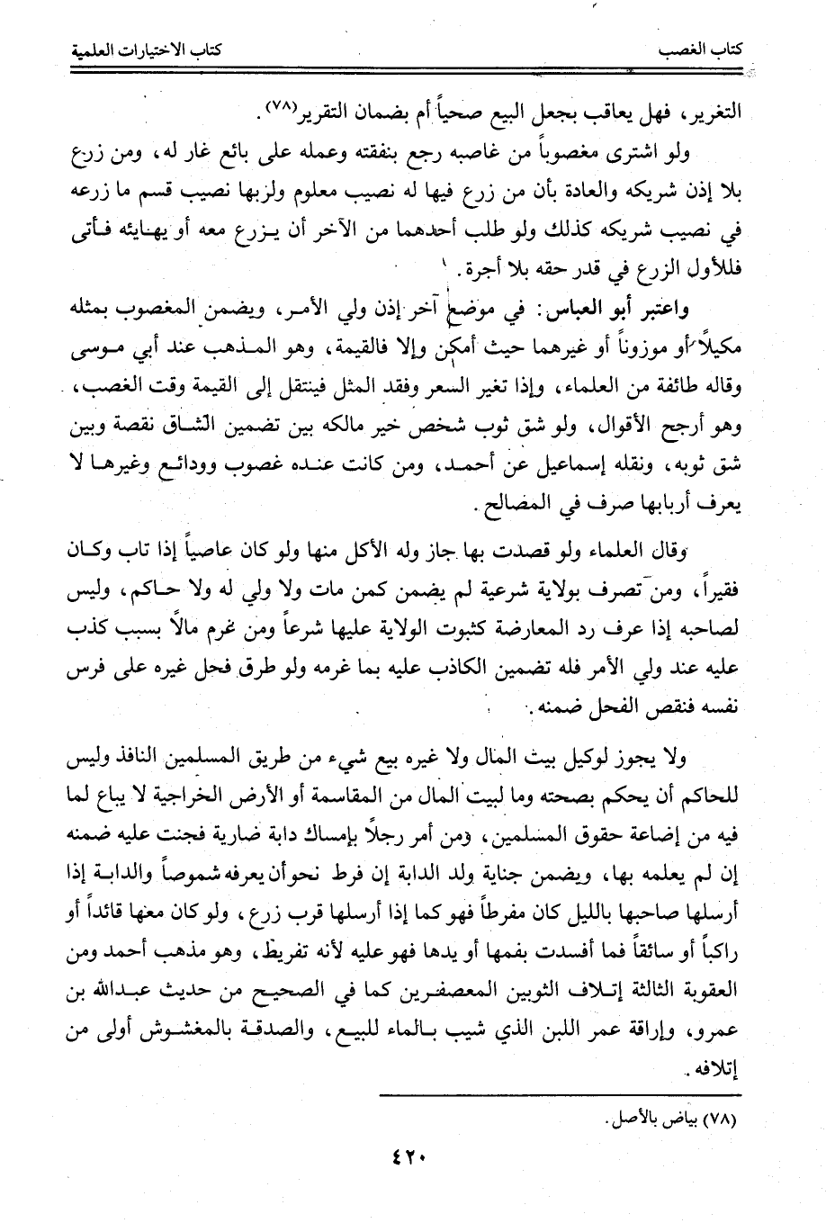 وَاعْتَبَرَ أَبُو الْعَبَّاسِ فِي مَوْضِعٍ آخَرَ إذْنَ وَلِيِّ الْأَمْرِ، وَيَضْمَنُ الْمَغْصُوبَ بِمِثْلِهِ مَكِيلًا أَوْ مَوْزُونًا أَوْ غَيْرَهُمَا حَيْثُ أَمْكَنَ وَإِلَّا فَالْقِيمَةُ، وَهُوَ الْمَذْهَبُ عِنْدَ أَبِي مُوسَى وَقَالَهُ طَائِفَةٌ مِنْ الْعُلَمَاءِ، وَإِذَا تَغَيَّرَ السِّعْرُ وَفُقِدَ الْمِثْلُ فَيُنْتَقَلُ إلَى الْقِيمَةِ وَقْتَ الْغَصْبِ، وَهُوَ أَرْجَحُ الْأَقْوَالِ، وَلَوْ شَقَّ ثَوْبَ شَخْصٍ خُيِّرَ مَالِكُهُ بَيْنَ تَضْمِينِ الشَّاقِّ نَقْصَهُ وَبَيْنَ شَقِّ ثَوْبِهِ، وَنَقَلَهُ إسْمَاعِيلُ عَنْ أَحْمَدَ، وَمَنْ كَانَتْ عِنْدَهُ غُصُوبٌ وَوَدَائِعُ وَغَيْرُهَا لَا يَعْرِفُ أَرْبَابَهَا صَرَفَ فِي الْمَصَالِحِ.