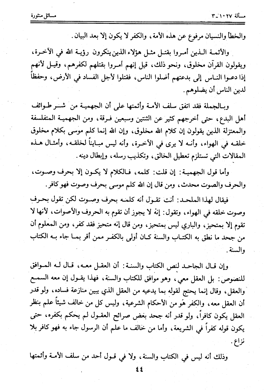 وَبِالْجُمْلَةِ فَقَدْ اتَّفَقَ سَلَفُ الْأُمَّةِ وَأَئِمَّتُهَا عَلَى أَنَّ الْجَهْمِيَّةَ مِنْ شَرِّ طَوَائِفِ أَهْلِ الْبِدَعِ، حَتَّى أَخْرَجَهُمْ كَثِيرٌ عَنْ الثِّنْتَيْنِ وَسَبْعِينَ فِرْقَةً، وَمِنْ الْجَهْمِيَّةِ الْمُتَفَلْسِفَةُ وَالْمُعْتَزِلَةُ الَّذِينَ يَقُولُونَ إنَّ كَلَامَ اللَّهِ مَخْلُوقٌ، وَإِنَّ اللَّهَ إنَّمَا كَلَّمَ مُوسَى بِكَلَامٍ مَخْلُوقٍ خَلَقَهُ فِي الْهَوَاءِ، وَإِنَّهُ لَا يُرَى فِي الْآخِرَةِ، وَإِنَّهُ لَيْسَ مُبَايِنًا لِخَلْقِهِ، وَأَمْثَالُ هَذِهِ الْمَقَالَاتِ الَّتِي تَسْتَلْزِمُ تَعْطِيلَ الْخَالِقِ، وَتَكْذِيبَ رُسُلِهِ، وَإِبْطَالَ دِينِهِ.